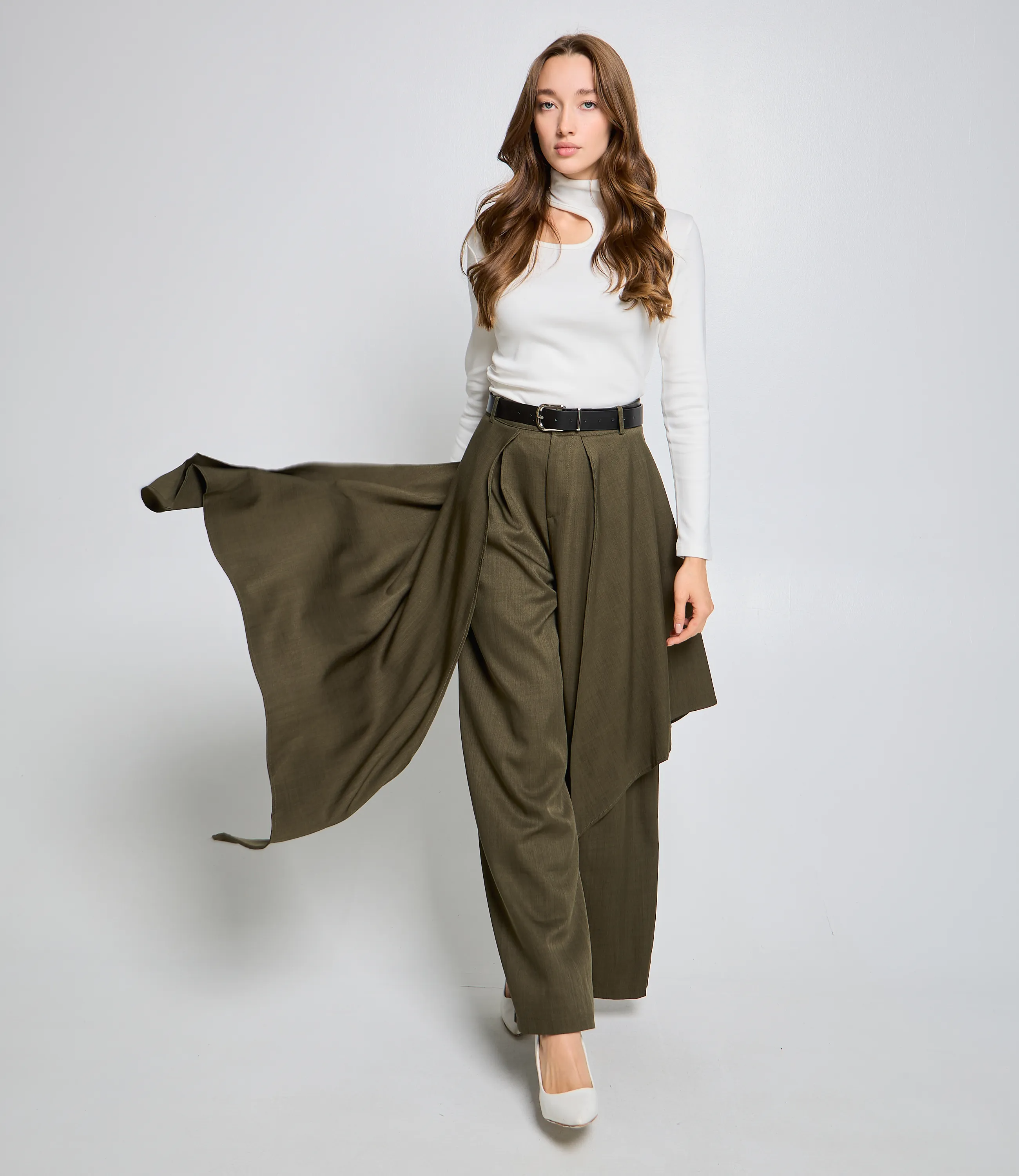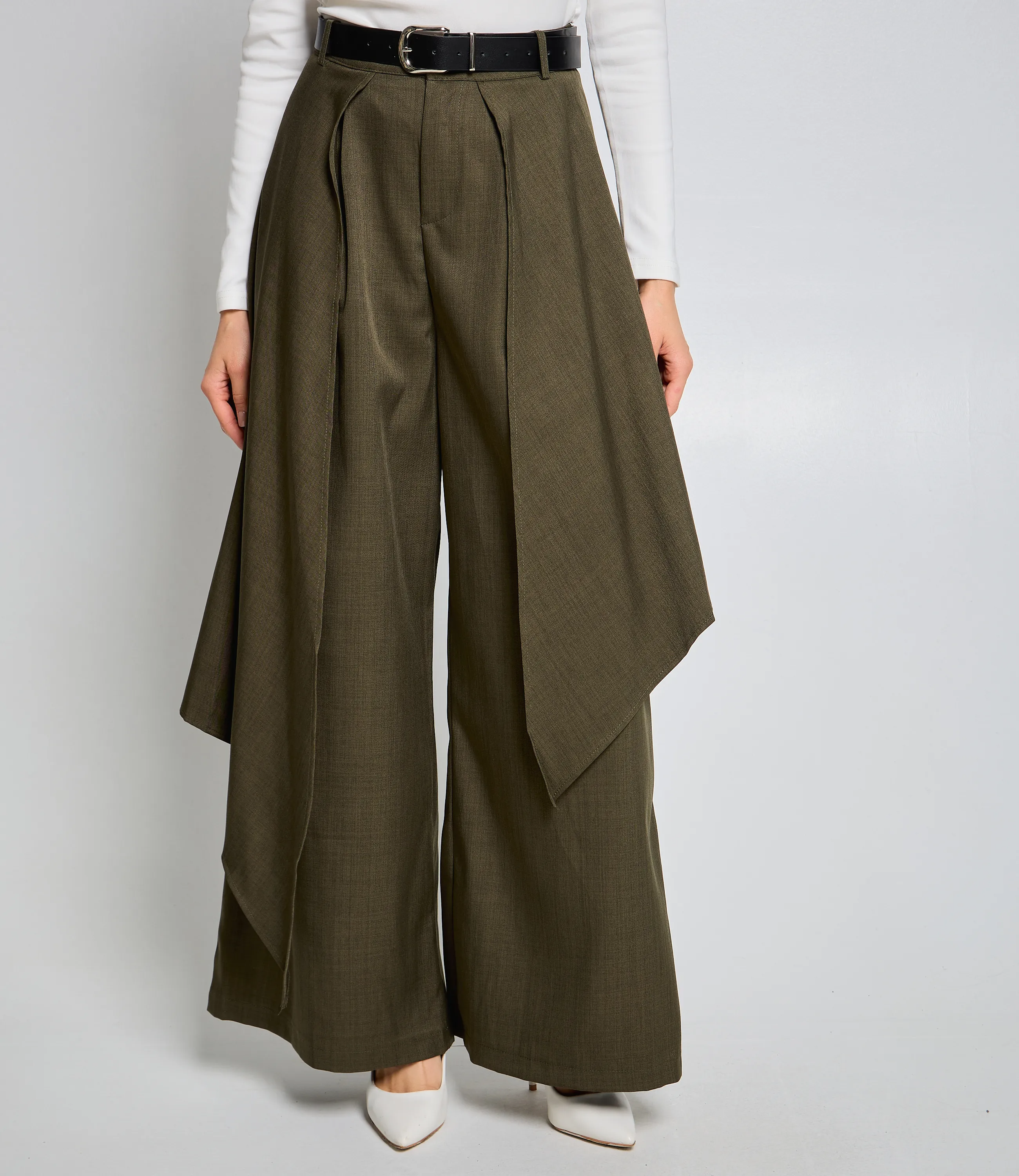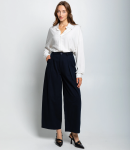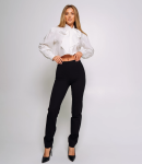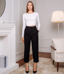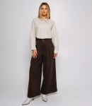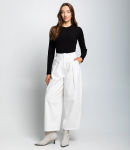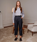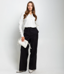 Брюки — это часть гардероба, которая подчёркивает уникальность и стиль каждой покупательницы.Брюки с высокой талией и свободным, слегка расширенным силуэтом, прямыми брючинами, которые сохраняют линию от бёдер до щиколотки; широкий пояс со шлевками для ремня и скрытой застёжкой спереди, виден ремень с пряжкой; передняя часть украшена крупными встречными складками от пояса, придающими объём в области бёдер и мягко рассеивающими ткань вниз, боковые швы гладкие, карманы, вероятно, скрытые в швах. Для пошива использована ткань 80% полиэстер, 20% хлопок: хлопок обеспечивает комфорт, приятные тактильные ощущения и хорошую воздухопроницаемость, полиэстер добавляет прочности, уменьшает усадку и помогает сохранять форму при активной носке и стирках. Комбинация материалов делает модель долговечной и презентабельной даже при интенсивной эксплуатации, что снижает процент рекламаций и возвратов. Для оптовых покупателей это привлекательная и оборотистая позиция: актуальный дизайн и универсальный крой упрощают формирование размерного ряда, а выразительные декоративные элементы повышают привлекательность товара на витрине. Рост модели: 168, параметры: 85-63-92.