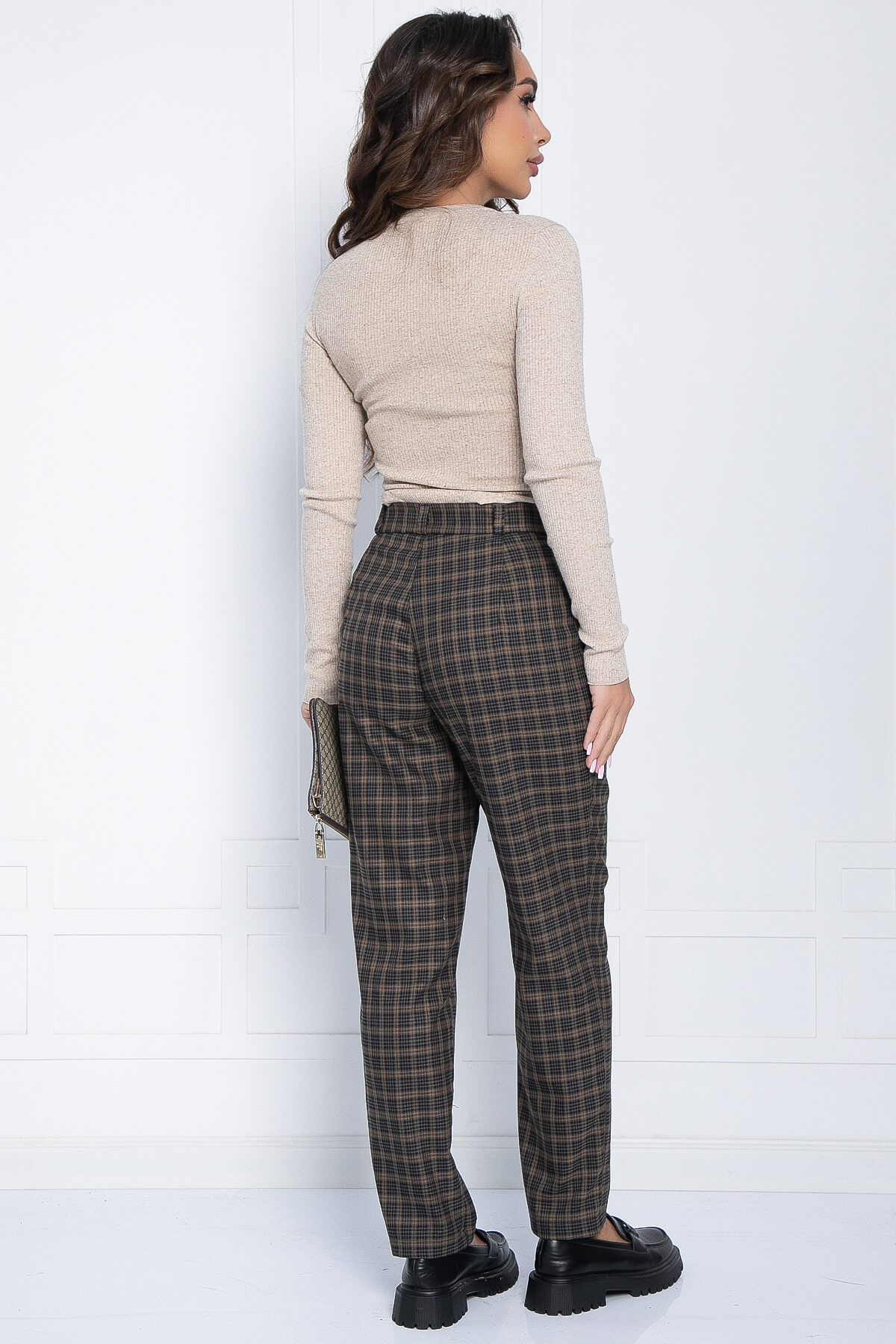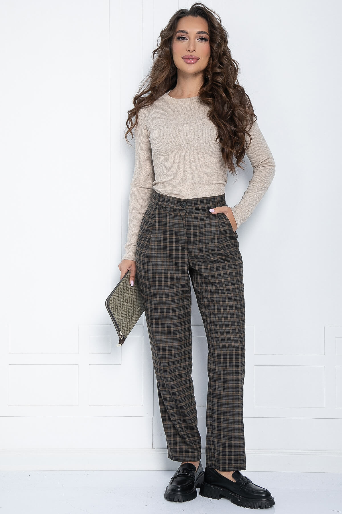 Прямые классические брюки в клетку — отличный выбор для офиса, прогулок и повседневной носки. Они прекрасно сочетаются с однотонным верхом. Брюки имеют пояс со шлёвками (петлями для ремня). Силуэт брюк полуприлегающий, к низу они заужены. В боковых швах расположены карманы.