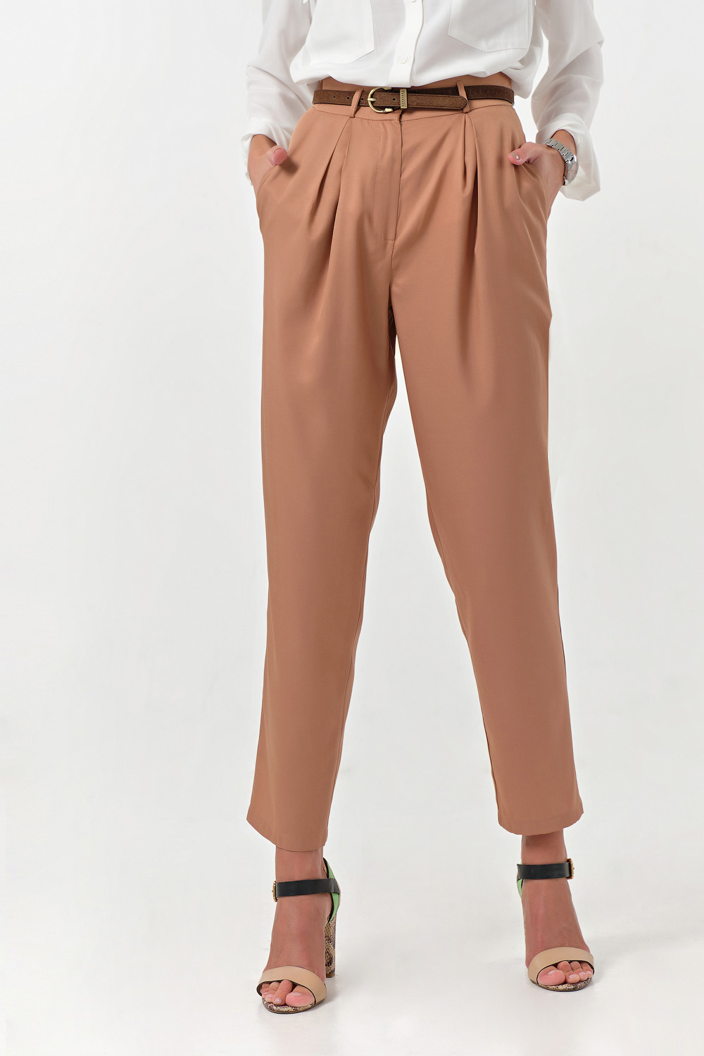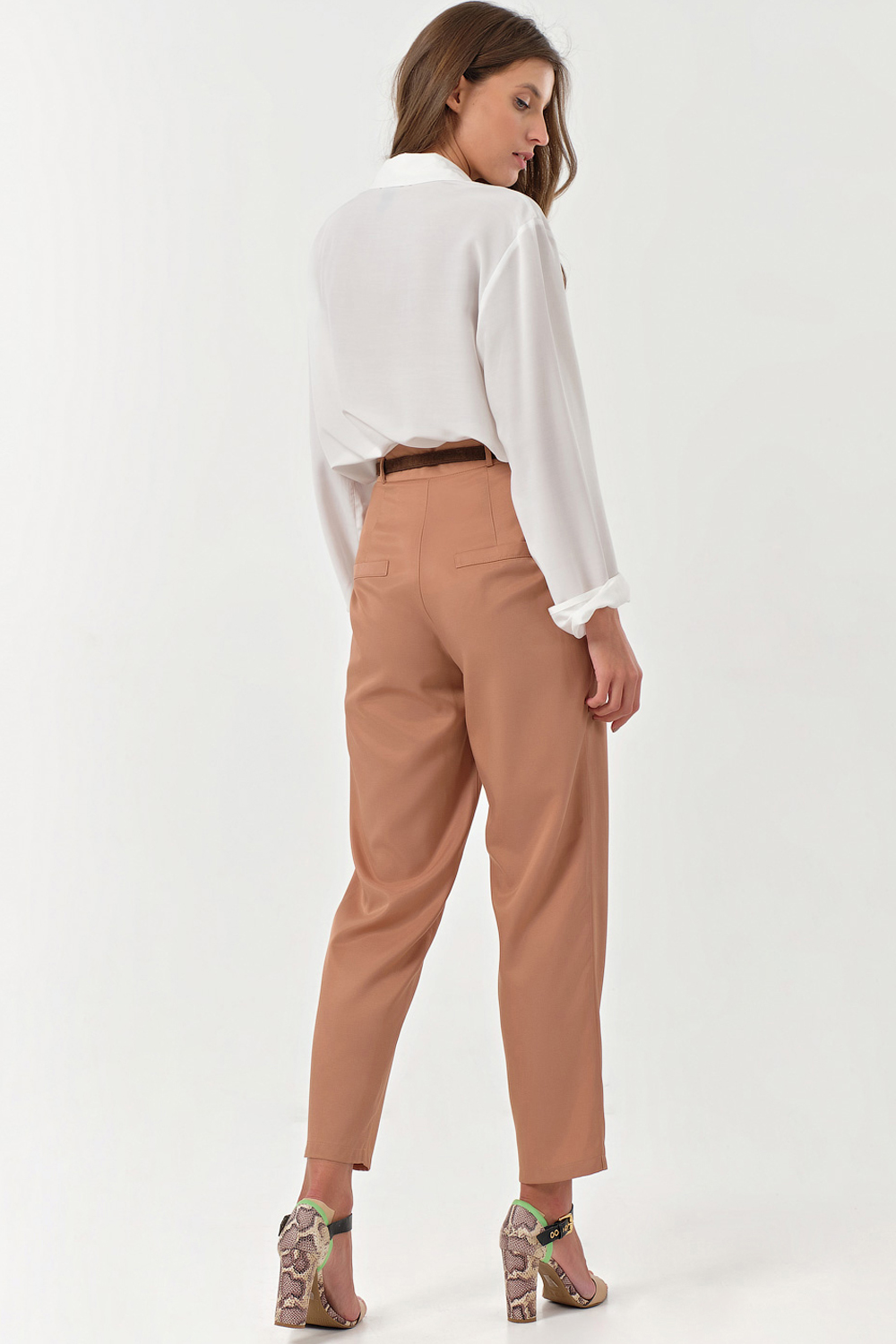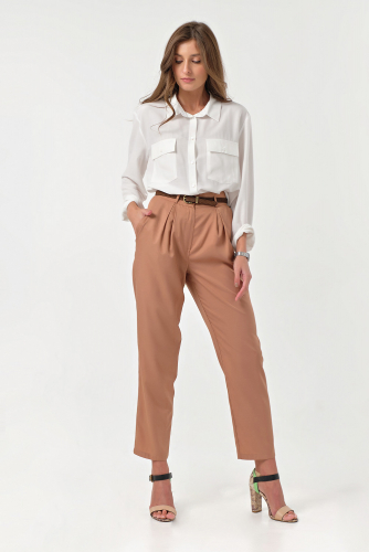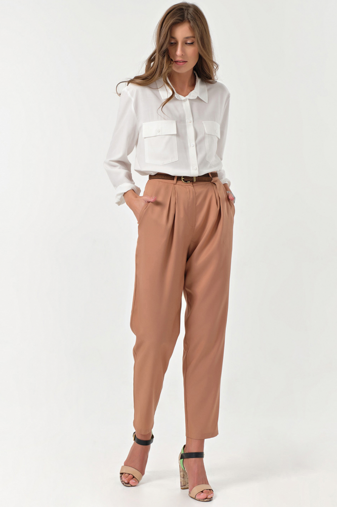 • Особенности: Брюки свободного силуэта зауженные к низу. Детали: притачной пояс со шлевками, по переду защипы и боковые карманы, декоративные листочки на спинке. Застежка на молнию и крючок.