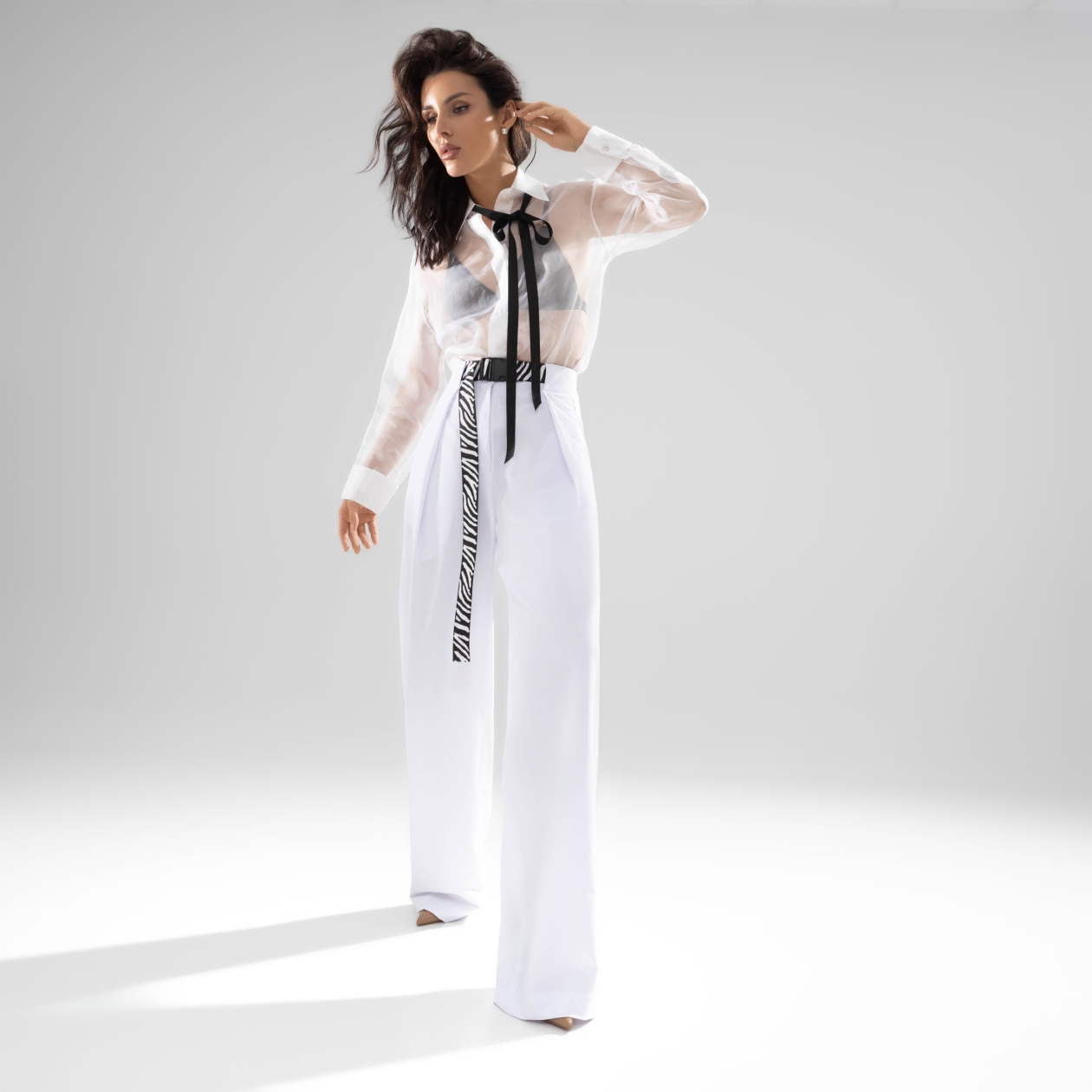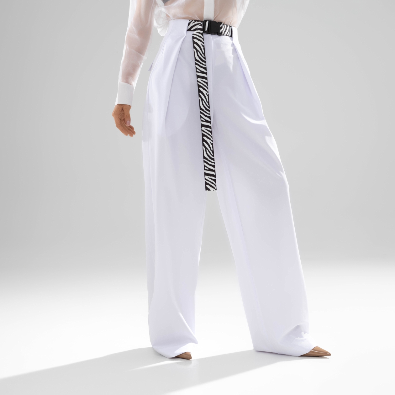 Ни один базовый гардероб не обходится без брюк белого цвета. Классика высокого стиля. Универсальный ответ на любые стилистические запросы. Брюки в белом цвете с высокой посадкой. Акцентный пояс в комплекте. Широкий крой штанин. Имитация карманов сзади. Длина подходит высоким девушкам.
