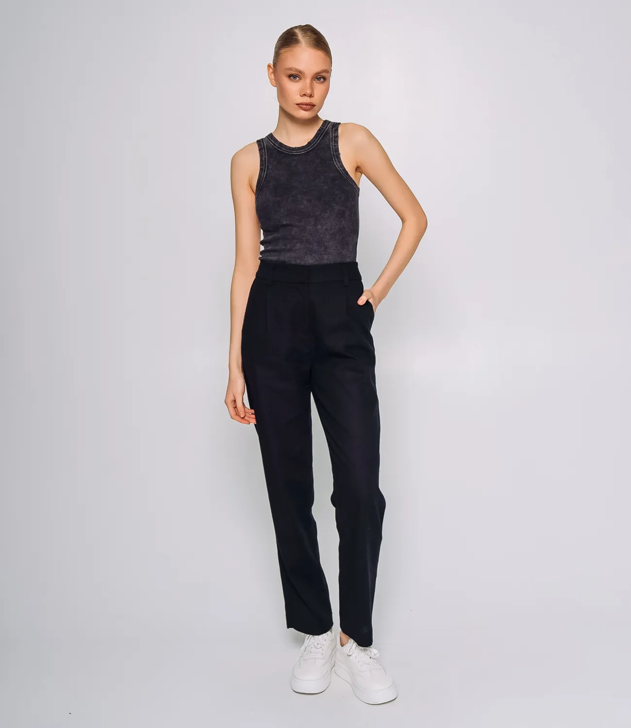 Брюки – это незаменимая часть гардероба, которая подчеркивает женственность и уникальность каждой представительницы прекрасного пола. Брюки имеют классический и элегантный вид, подходящие для различных случаев, как повседневных, так и более формальных. Брюки имеют высокую посадку, что помогает подчеркнуть талию и визуально удлиняет ноги. Эти брюки легко комбинируются с различными элементами одежды, что позволяет создавать стильные образы для любого случая. Производитель знает, как разработать стильные и комфортные решения, которые удовлетворяют потребности самых требовательных клиентов. Для пошива использована ткань 70% ацетат и 30% лен, которая характеризуется отличным качеством. Даже после множества стирок эти брюки сохранят свою первоначальную привлекательность и форму. Обратите внимание на цвет и текстуру ткани — они гармонично сочетаются с различными цветами и образами. Для удобства мы предоставили таблицу размеров на нашем сайте, чтобы ваши покупатели могли точно подобрать подходящий размер. Предложенная нами цена является доступной и выгодной для оптовых покупателей, что делает эти брюки отличным дополнением к ассортименту вашего магазина. Подарите своим клиентам удовольствие носить стильные и комфортные брюки, которые подойдут для любых летних дней! Рост модели: 173, параметры: 84-58-89.