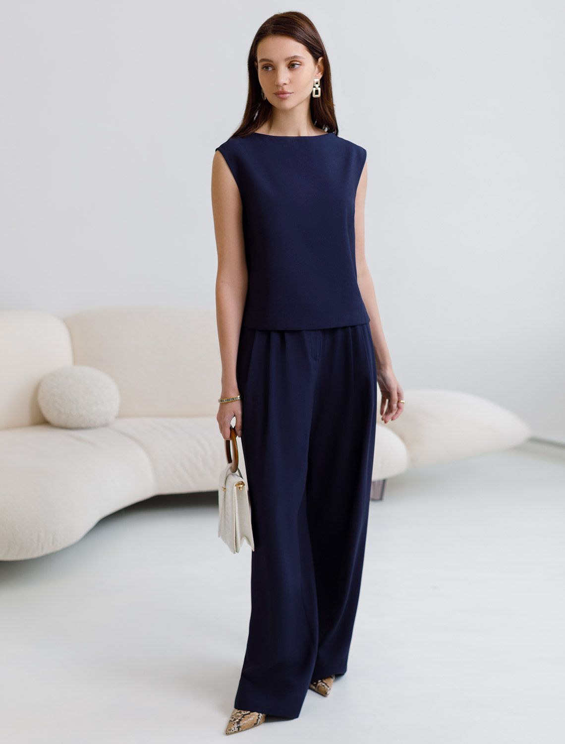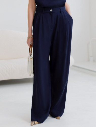 Брюки палаццо темно-синего цвета выполнены из плотного лиоцелла. Лиоцелл это более дорогой и экологичный вариант вискозы, очень прочный и шелковистый. Ткань отличается от регулярной коллекции из лиоцелла - она содержит еще больше лиоцелла (92%), благодаря чему имеет более нежную шелковистую фактуру. Свободные прямые брюки с высокой посадкой визуально вытягивают и стройнят фигуру. Удобные карманы по бокам и свободный крой делают эти брюки базовым элементом гардероба. Летние брюки отлично сочетаются с монохромным верхом, с ними можно создавать эффектные наряды как на выход, так и для ежедневных рабочих дел или простых прогулок, от делового шика до повседневного кэжуал.