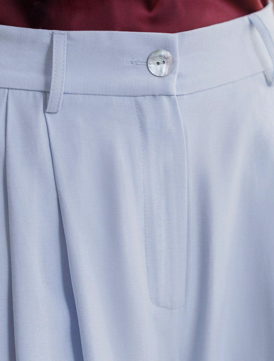 Брюки палаццо голубого цвета выполнены из плотного лиоцелла. Лиоцелл это более дорогой и экологичный вариант вискозы, очень прочный и шелковистый. Ткань отличается от регулярной коллекции из лиоцелла - она содержит еще больше лиоцелла (92%), благодаря чему имеет более нежную шелковистую фактуру. Свободные прямые брюки с высокой посадкой визуально вытягивают и стройнят фигуру. Удобные карманы по бокам и свободный крой делают эти брюки базовым элементом гардероба. Летние брюки отлично сочетаются с монохромным верхом, с ними можно создавать эффектные наряды как на выход, так и для ежедневных рабочих дел или простых прогулок, от делового шика до повседневного кэжуал.