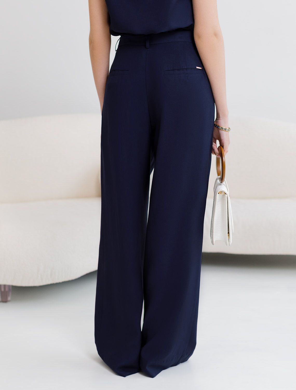 Брюки палаццо темно-синего цвета выполнены из плотного лиоцелла. Лиоцелл это более дорогой и экологичный вариант вискозы, очень прочный и шелковистый. Ткань отличается от регулярной коллекции из лиоцелла - она содержит еще больше лиоцелла (92%), благодаря чему имеет более нежную шелковистую фактуру. Свободные прямые брюки с высокой посадкой визуально вытягивают и стройнят фигуру. Удобные карманы по бокам и свободный крой делают эти брюки базовым элементом гардероба. Летние брюки отлично сочетаются с монохромным верхом, с ними можно создавать эффектные наряды как на выход, так и для ежедневных рабочих дел или простых прогулок, от делового шика до повседневного кэжуал.