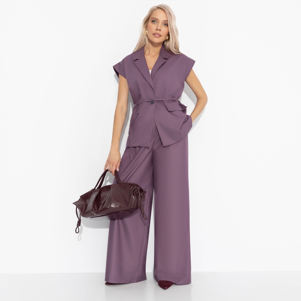 Брюки ЧАРУТТИ цвета созревающей сливы выделят вас среди черных и серых образов. Оставайтесь деловой леди, но добавьте в свой образ изюминку. Вы будете заметны и притягательны. Пройти без очереди – возможно! Познакомиться с нужным человеком – легко! Вечером пойти на свидание – без вопросов! Брюки широкие с карманами. Посадка на талии. Брюки застегиваются на молнию и пуговицу. Есть шлевки.