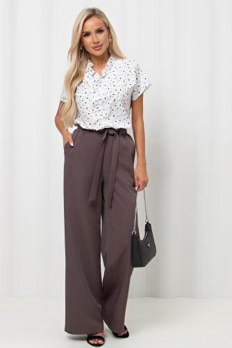 Стильные брюки прямого кроя с высокой посадкой на талии. Верх оформлен притачным поясом со шлевками под ремень и резинкой по спинке. Застежка на пуговицу и молнию оформлена гульфиком. Модель имеет функциональные карманы в боковых швах.