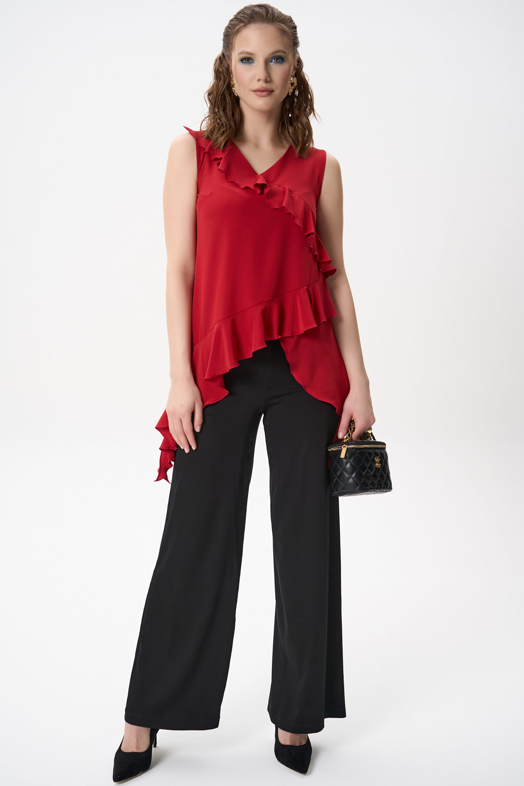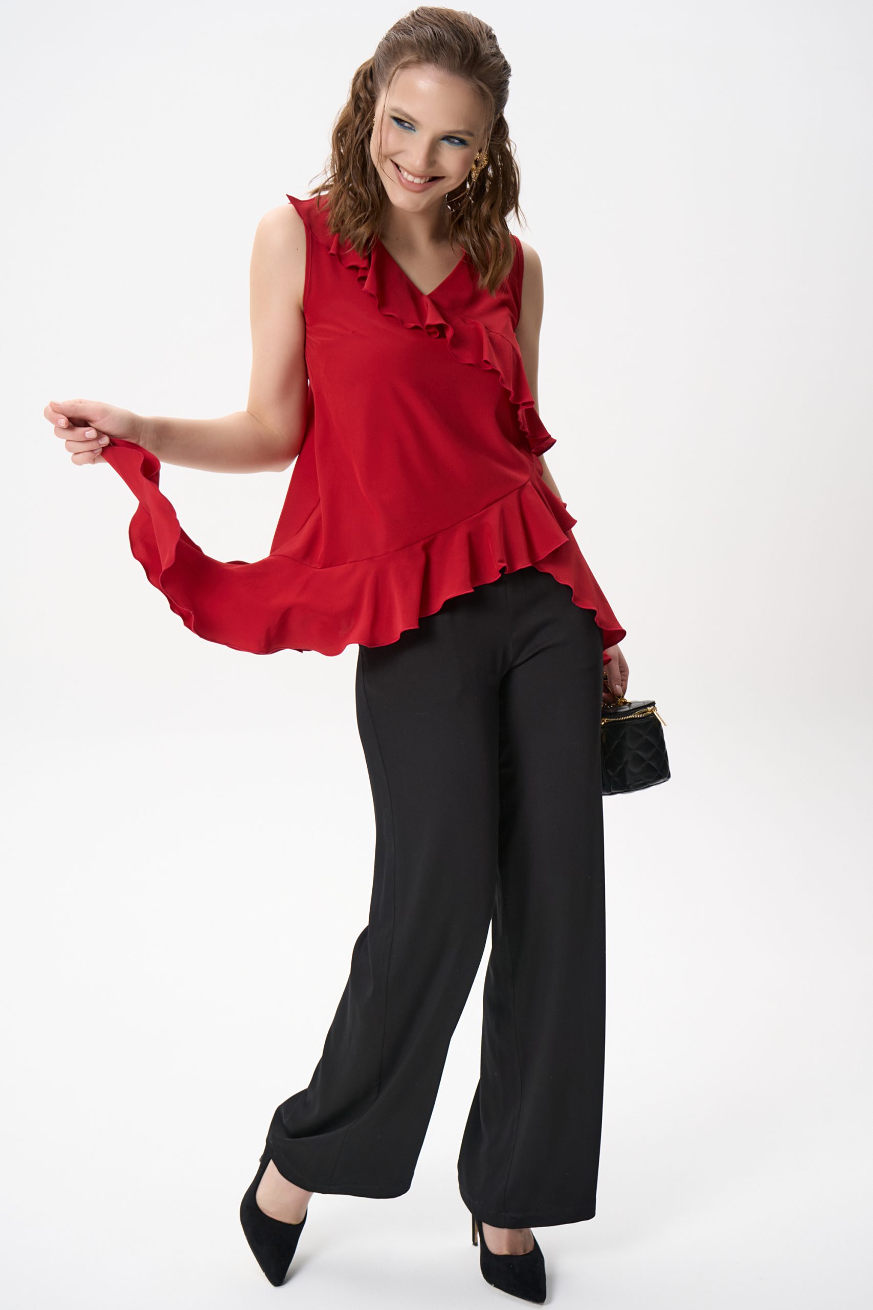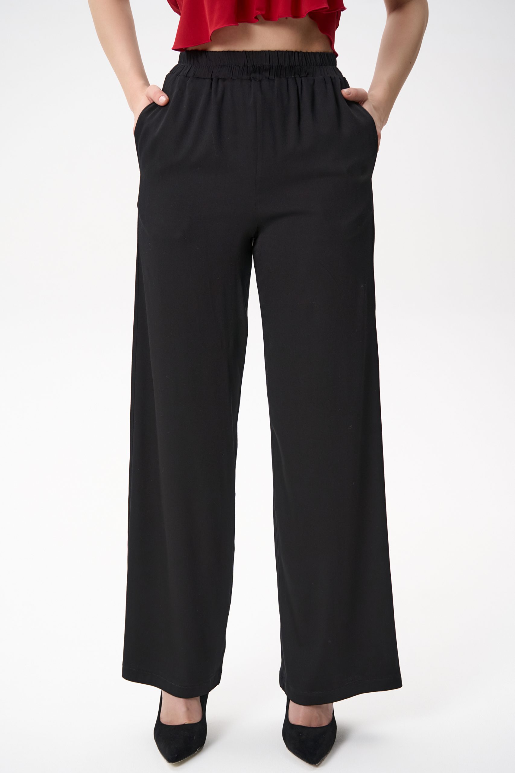 Брюки выполнены из штапельной ткани — материала, известного своей воздухопроницаемостью, мягкостью и комфортом при носке, особенно в тёплый сезон.
