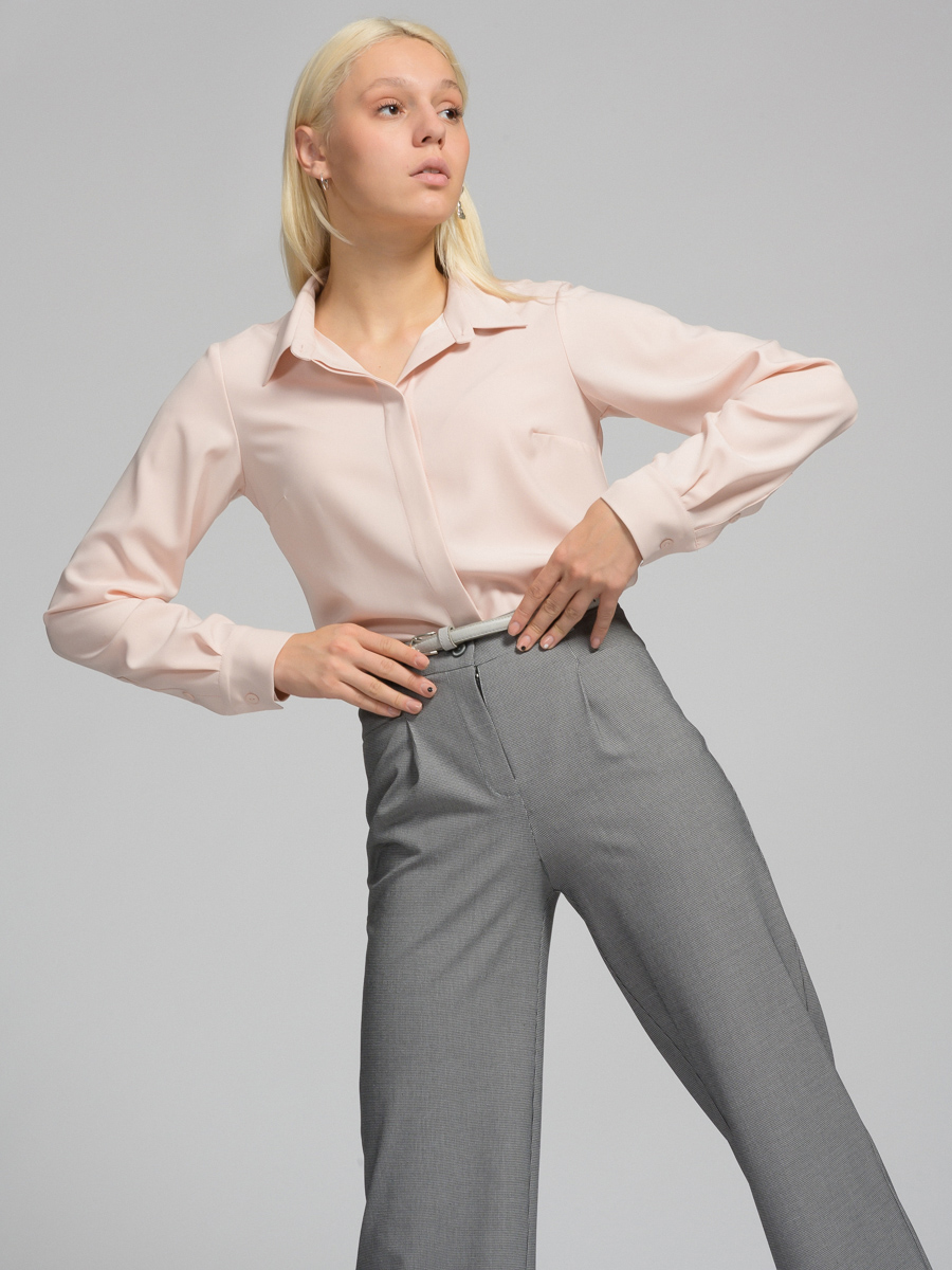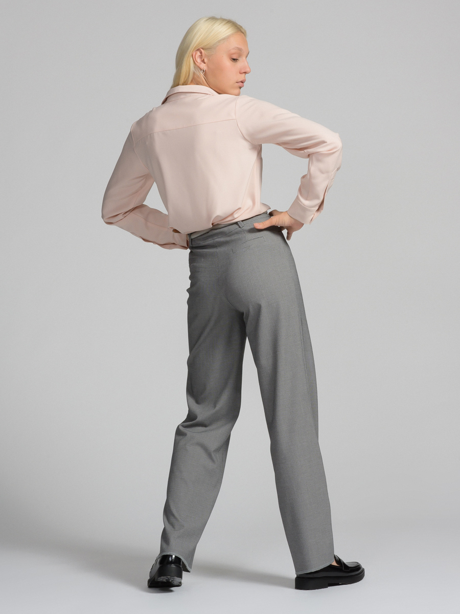 складки. Сзади имитация карманов. Застежка-гульфик на молнии. Рост модели 173 см. Размер изделия на модели 42. Машинная деликатная стирка.