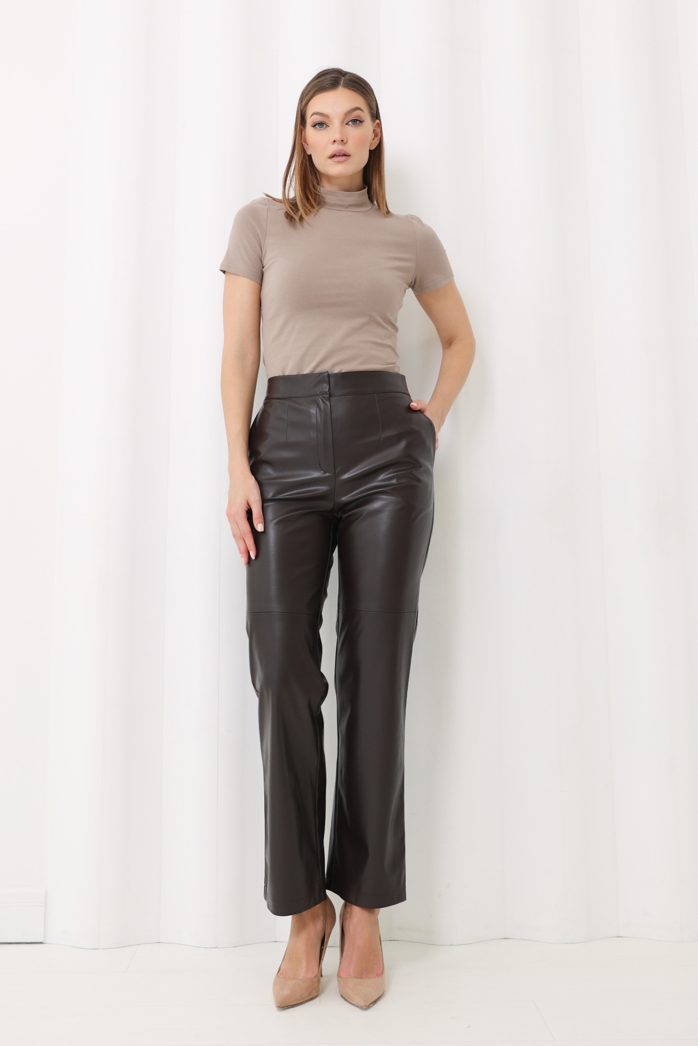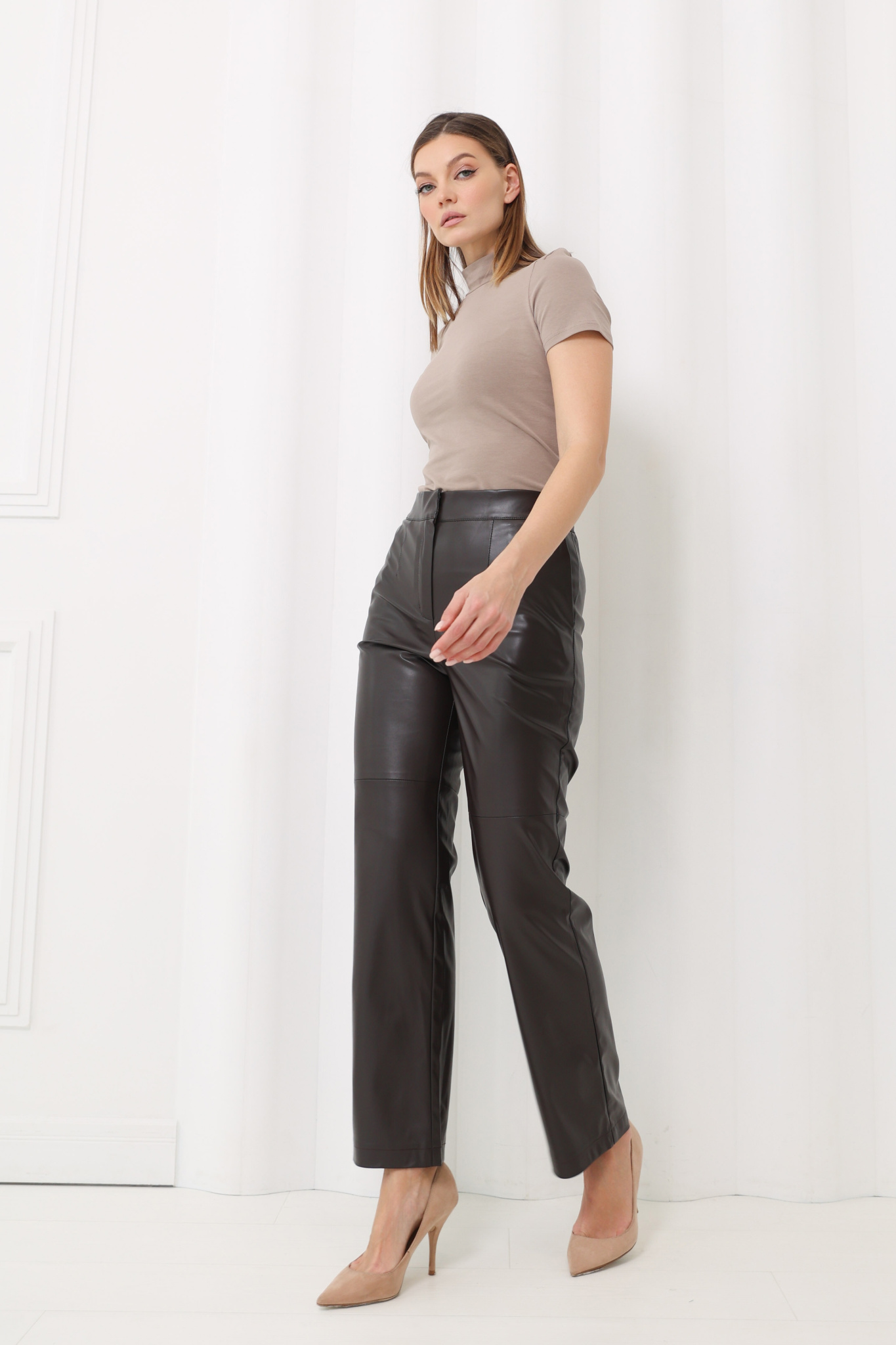 Брюки прямого кроя из искусственной кожи с притачным поясом на резинке по спинке.