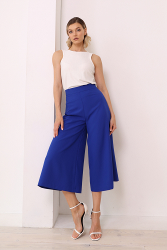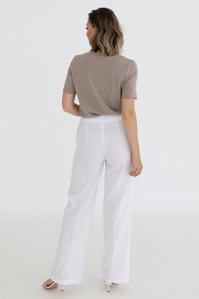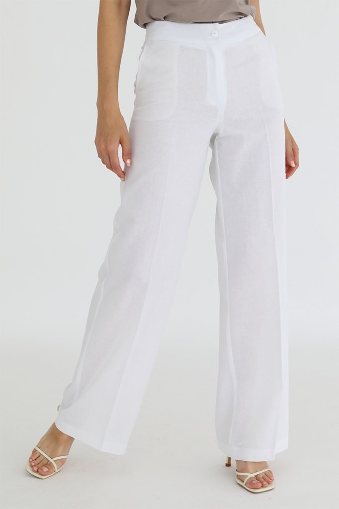 Брюки широкие прямого кроя с поясом. Застегиваются на молнию и пуговицу. Боковые карманы в швах, вытачки на поясе сзади.