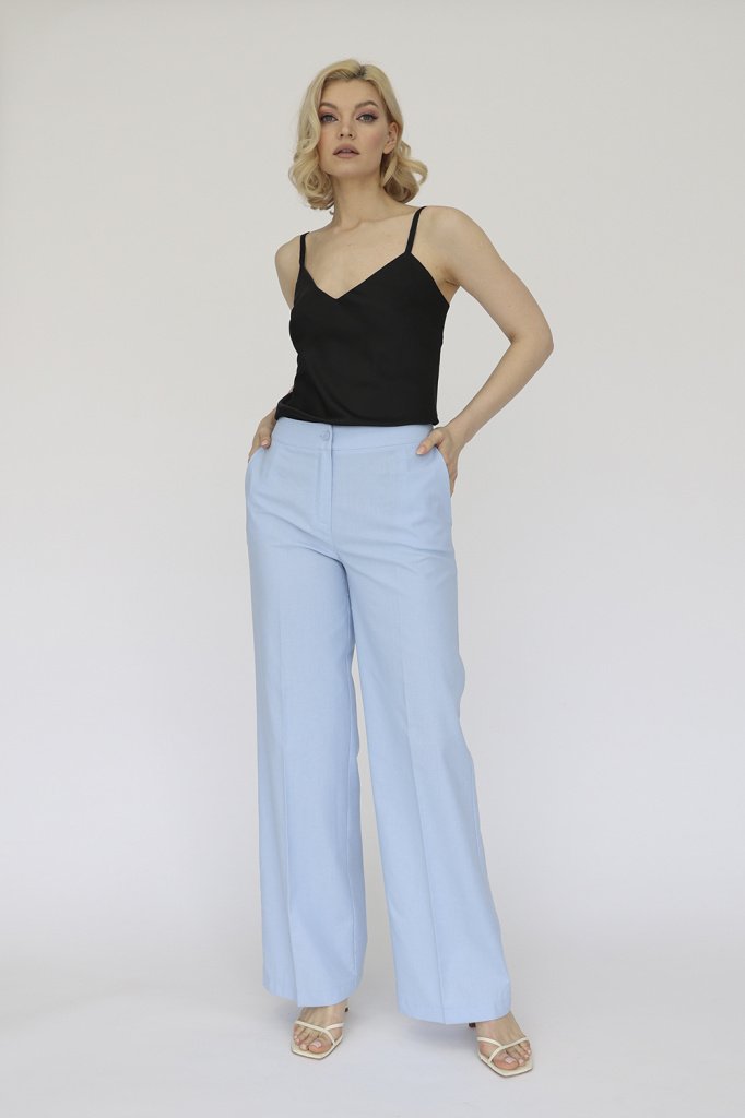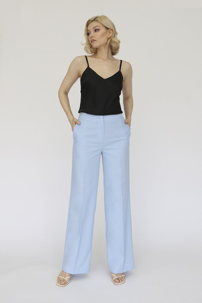 Брюки широкие прямого кроя с поясом. Застегиваются на молнию и пуговицу. Боковые карманы в швах, вытачки на поясе сзади.