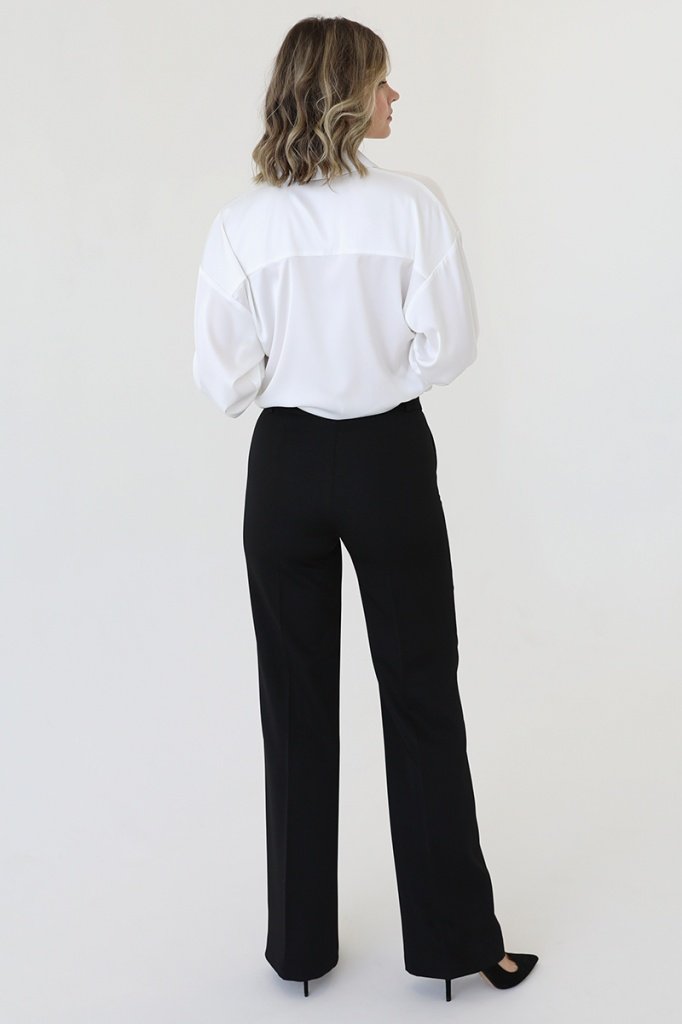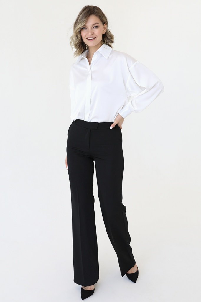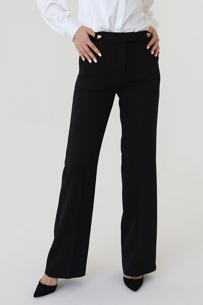 Брюки расклешенные книзу, втачной пояс со шлевками, боковые карманы и застежка на молнию.
