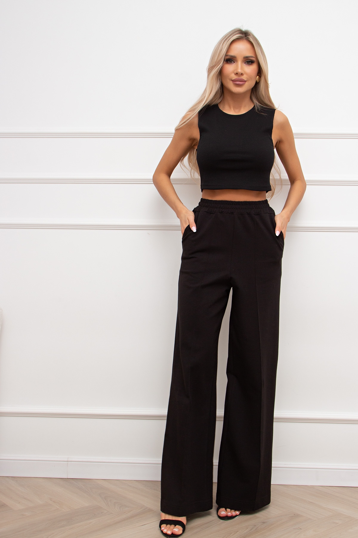 Прямые брюки из трикотажного полотна. Отрезной пояс по линии талии на широкой резинке. Спереди стрелка закреплена строчкой, что зрительно удлиняет ноги. Боковые карманы с отрезным бочком. Модель выполнена из качественного трикотажа, который хорошо держит форму. Прекрасная модель для активных будней и отдыха.