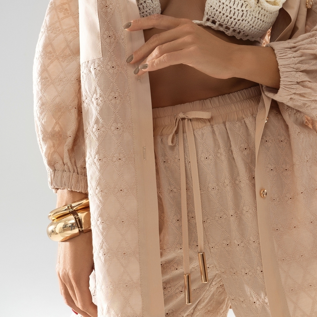 Брюки изготовлены из высококачественных материалов: 85% хлопка, 10% полиэстера и 5% спандекса. Батист с вышивкой придает брюкам изысканность, штапель обеспечивает легкость и воздухопроницаемость, а трикотажный подклад добавляет комфорта и эластичности. Эти материалы идеально сочетаются, создавая брюки, которые прекрасно держат форму и сохраняют свой первоначальный вид даже после множества стирок.