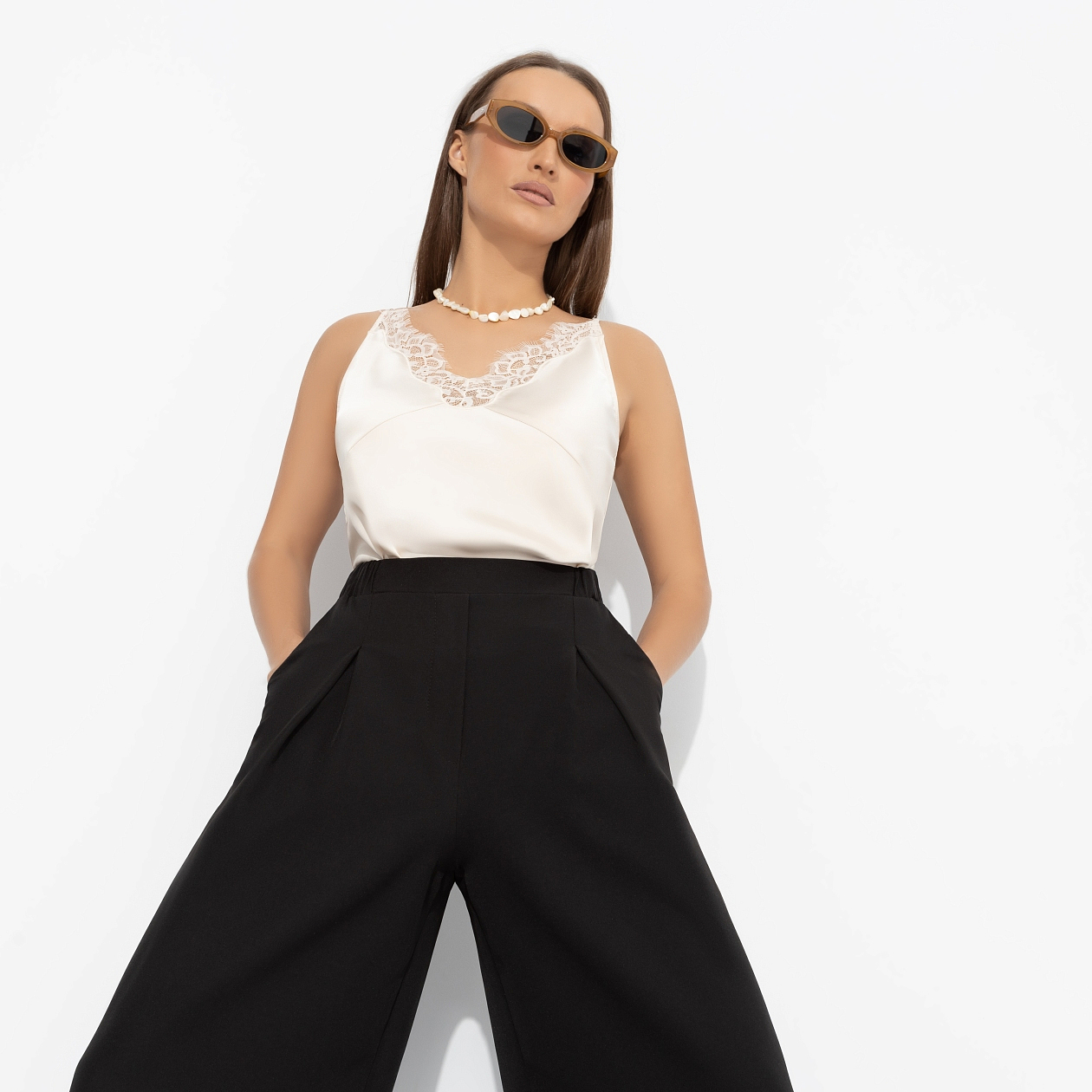 Брюки ЧАРУТТИ как страница из истории свободы, когда женщины смело заменили юбки на удобный крой и зашагали в ногу со временем. Их комфортный силуэт напоминает о первых дерзких парижанках 1930-х, которые бросили вызов условностям. В брюках ЧАРУТТИ ты празднуешь право быть собой – без оглядки на стереотипы. Брюки широкие. Посадка высокая на талии. Есть декоративные защипы. Изделие с карманами. Часть пояса со скрытой широкой резинкой. Брюки хорошо смотрятся на любом типе фигуры.