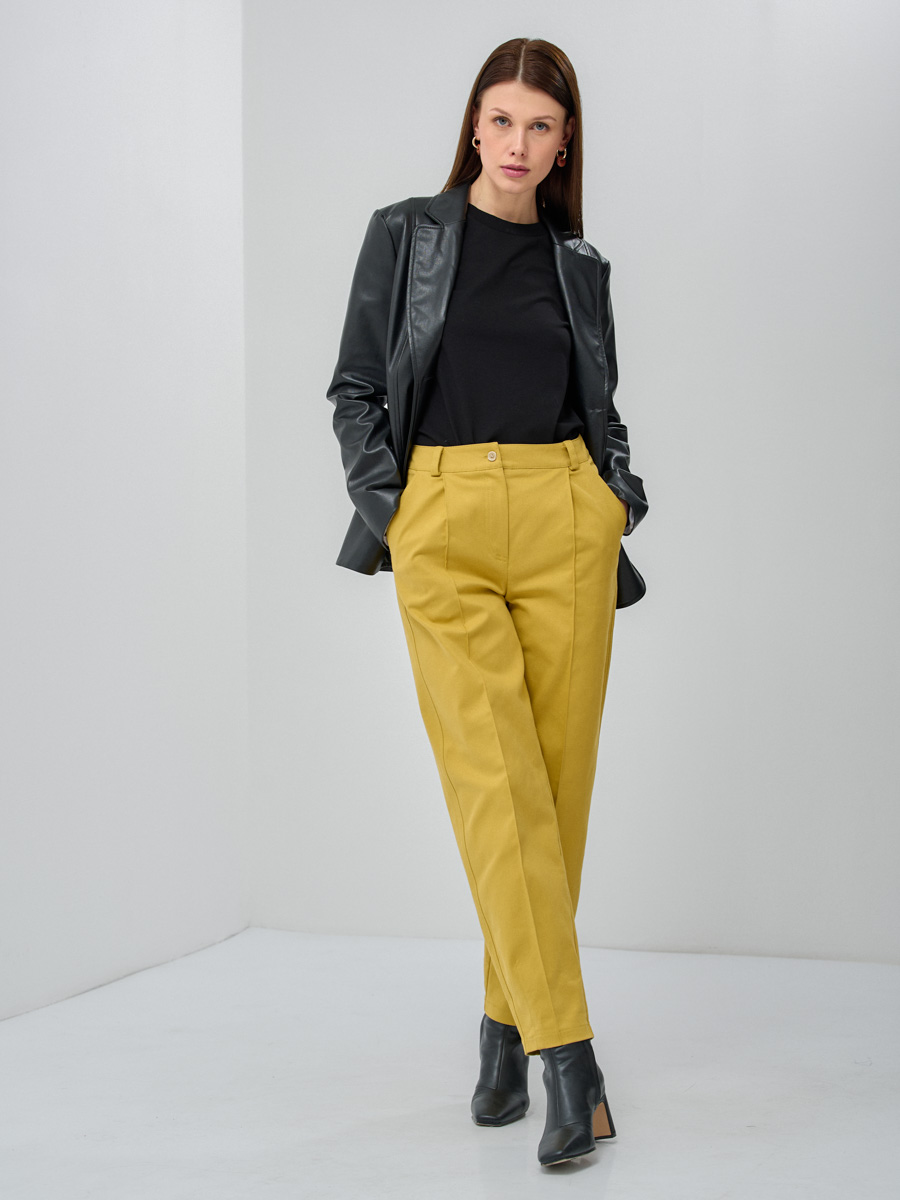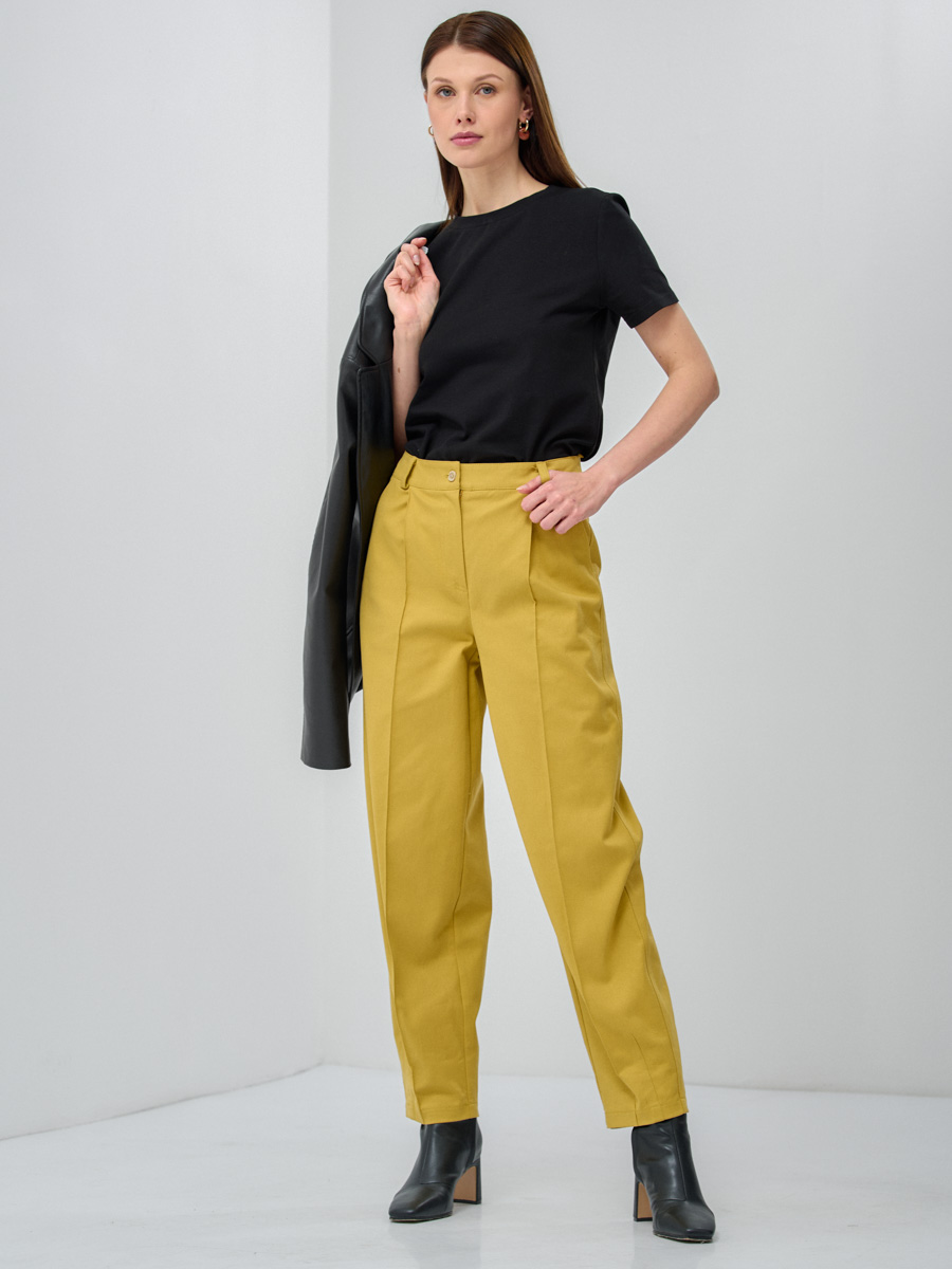 Брюки, зауженные книзу, с отстроченными стрелками. На линии талии притачной пояс. Средняя посадка, по бокам карманы. Снизу на передней и задней половинках брюк расположены выточки. Застежка-гульфик на молнии. Рост модели на фото 175 см. Размер брюк на модели 42. Машинная деликатная стирка.