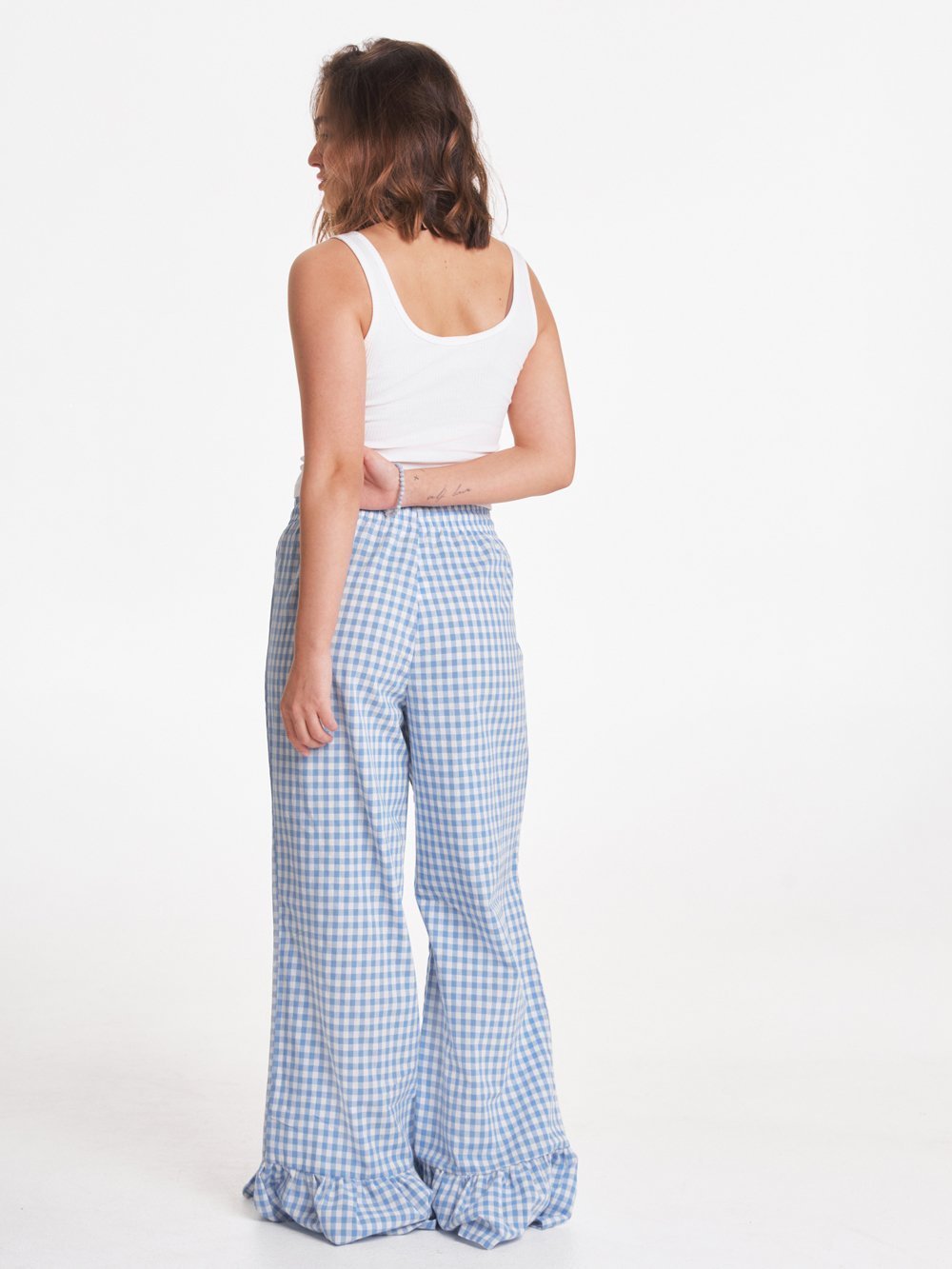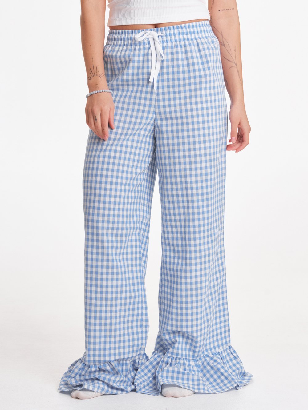 Брюки свободного силуэта  из  хлопка с мятым эффектом. Пояс на резинке со шнурком. Рюши по низу штанин.