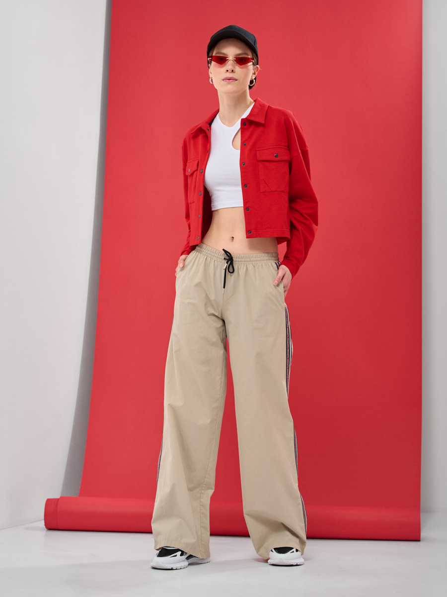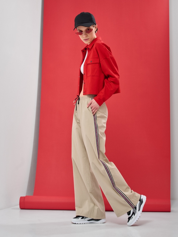 Брюки из хлопка, на резинке по талии и шнурком, декоративной отделкой кант, настрочной тесьмой по боковым швам и карманом.