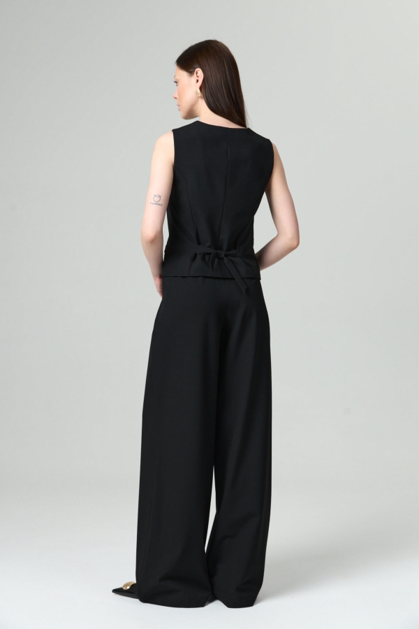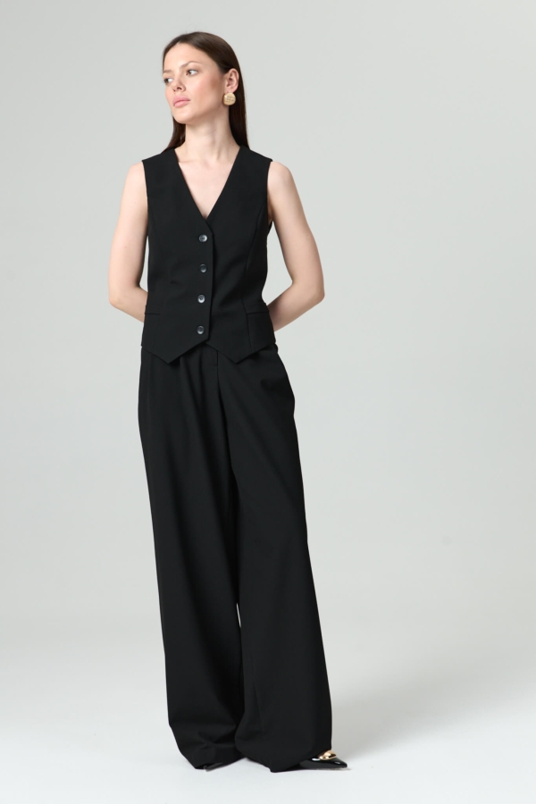 Брюки-палаццо из костюмной поливискозы. Модель свободного силуэта на притачном поясе со шлёвками. По спинке резинка. По переду карманы, защипы и застежка-гульфик.