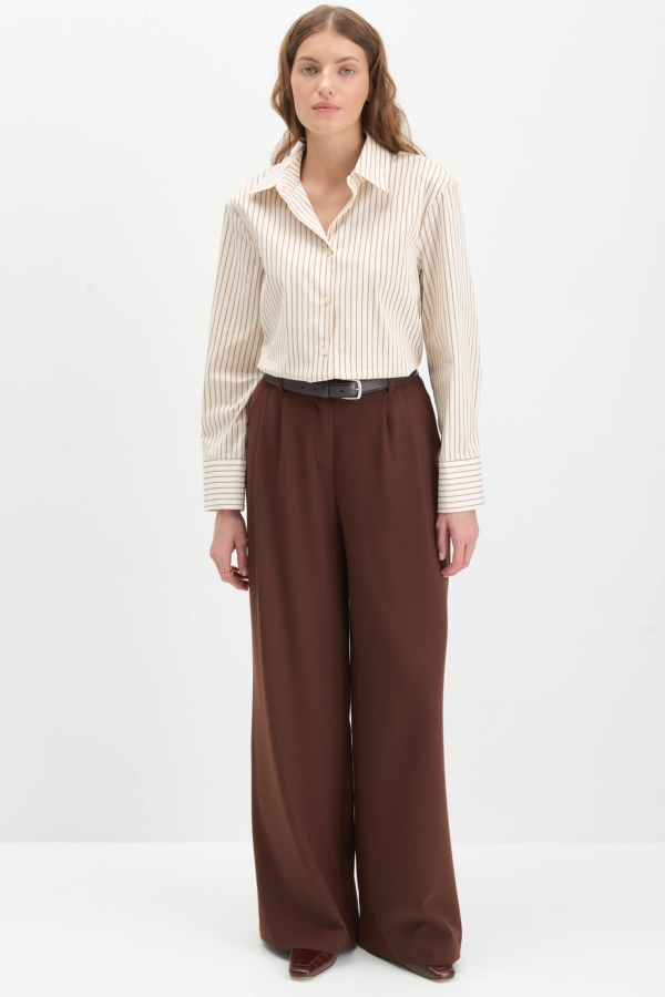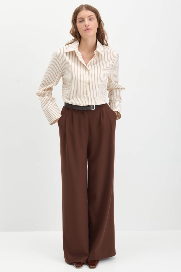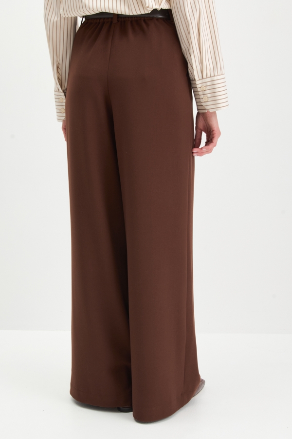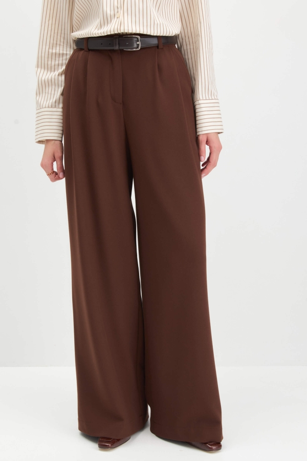 Брюки-палаццо из костюмного полотна. Модель свободного силуэта на притачном поясе со шлевками. По переду карманы, защипы и застёжка-гульфик. По спинке резинка для комфортной посадки.