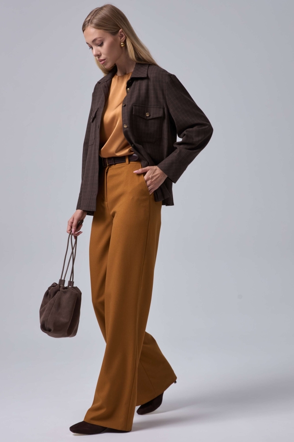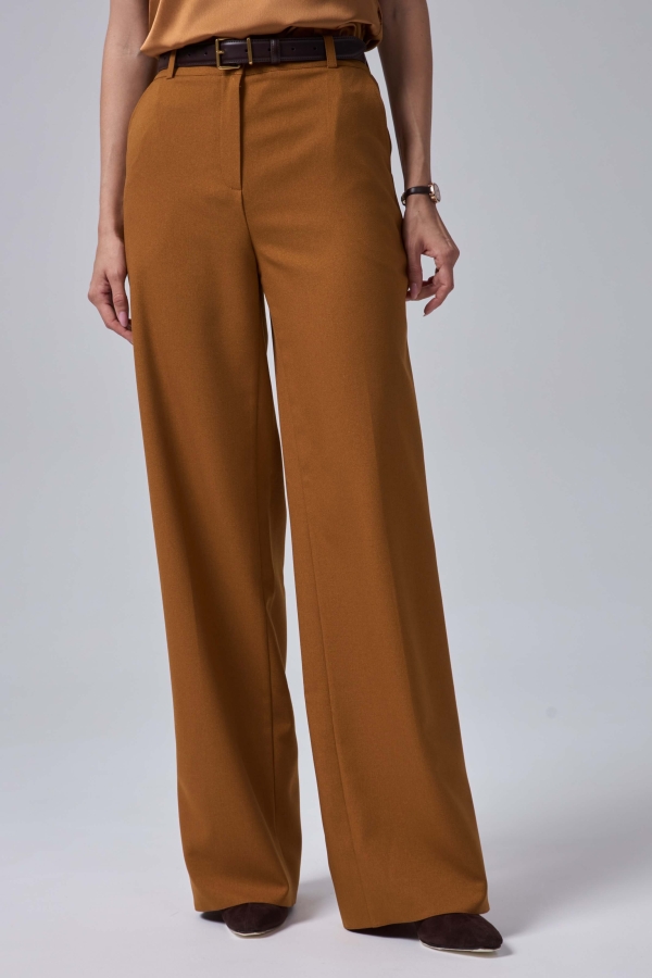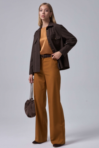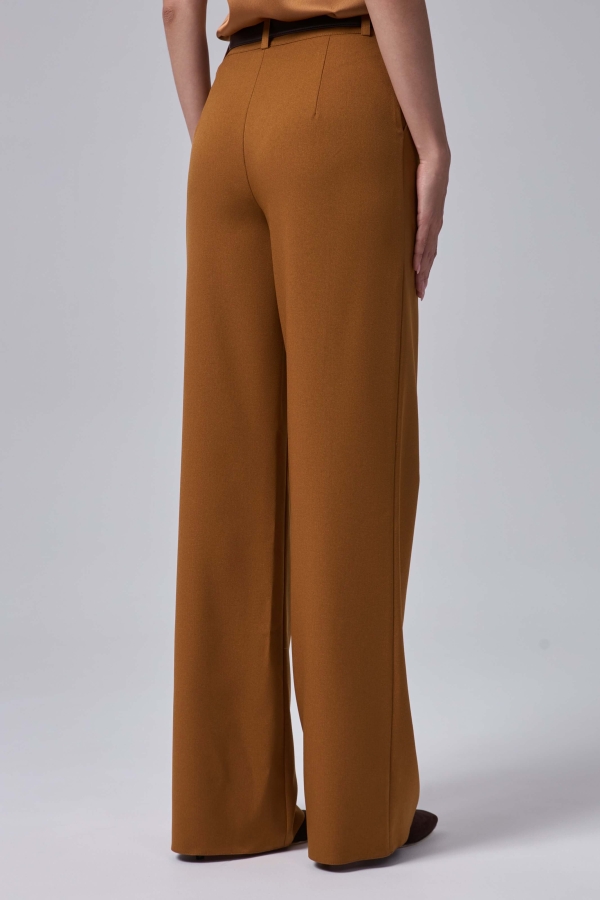 Брюки свободного силуэта из костюмной поливискозы. Модель средней посадки на притачном поясе со шлевками и стрелками.По переду карманы. Застежка гульфик на хлястик с пуговицей и потайной пуговицей.