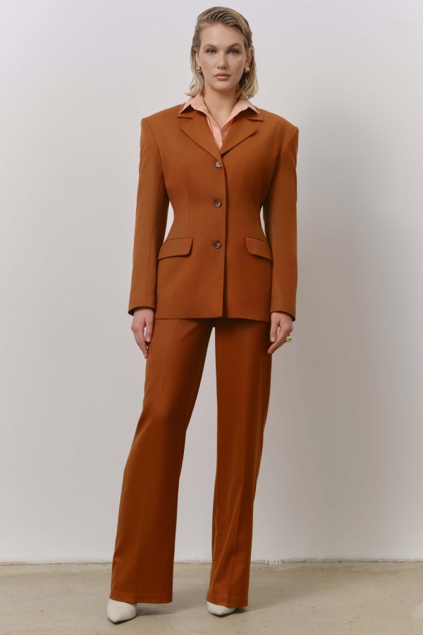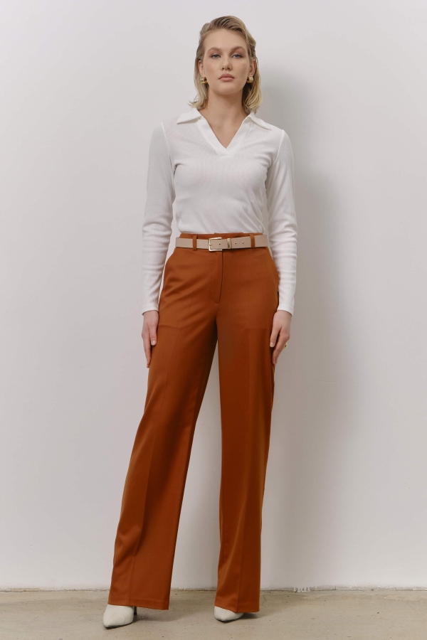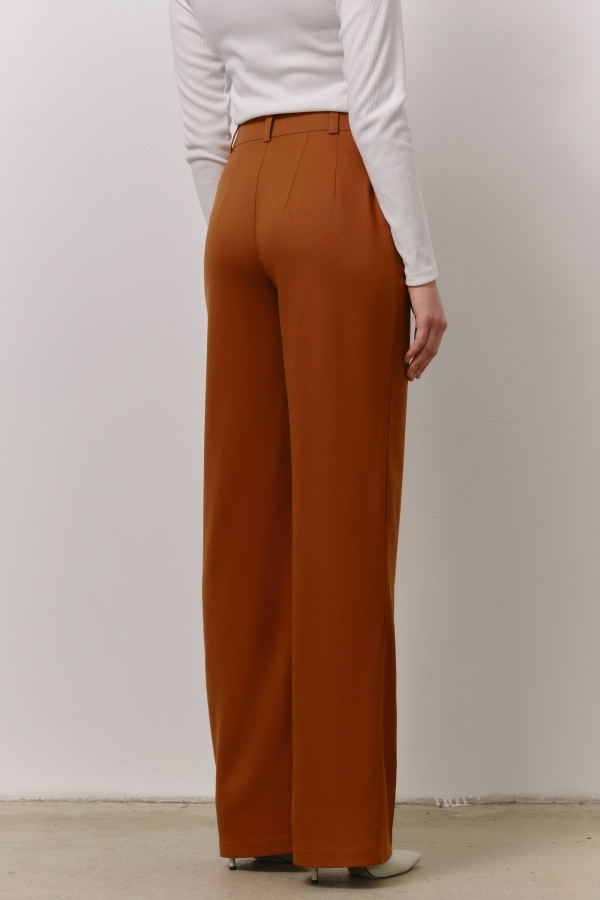 Брюки свободного силуэта благородного оттенка. Средняя посадка на притачном поясе со шлевками. По переду карманы. Застежка гульфик на хлястик с пуговицей и потайной пуговицей.