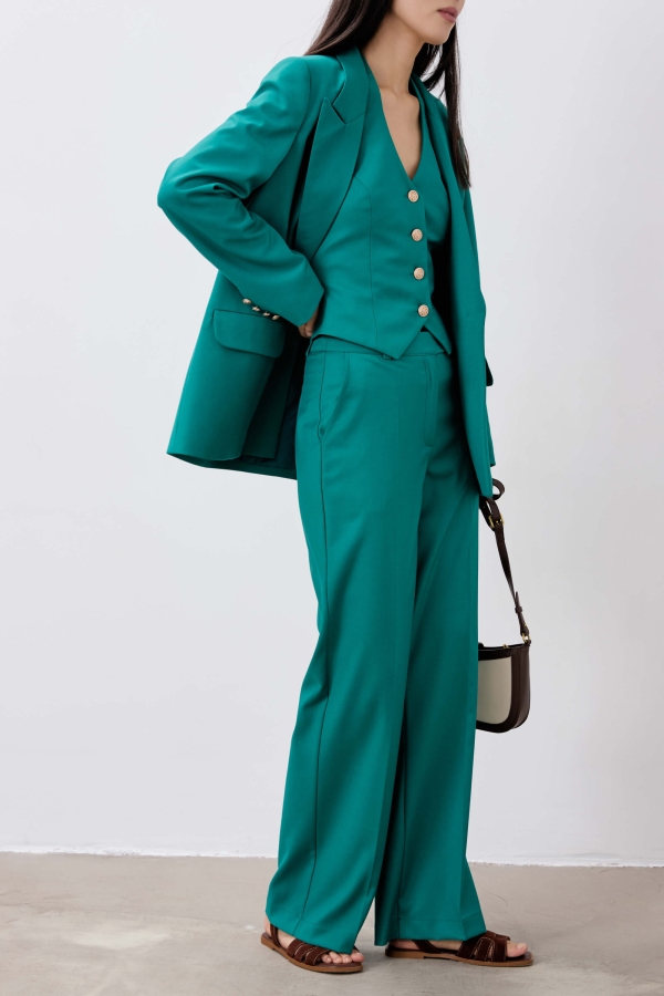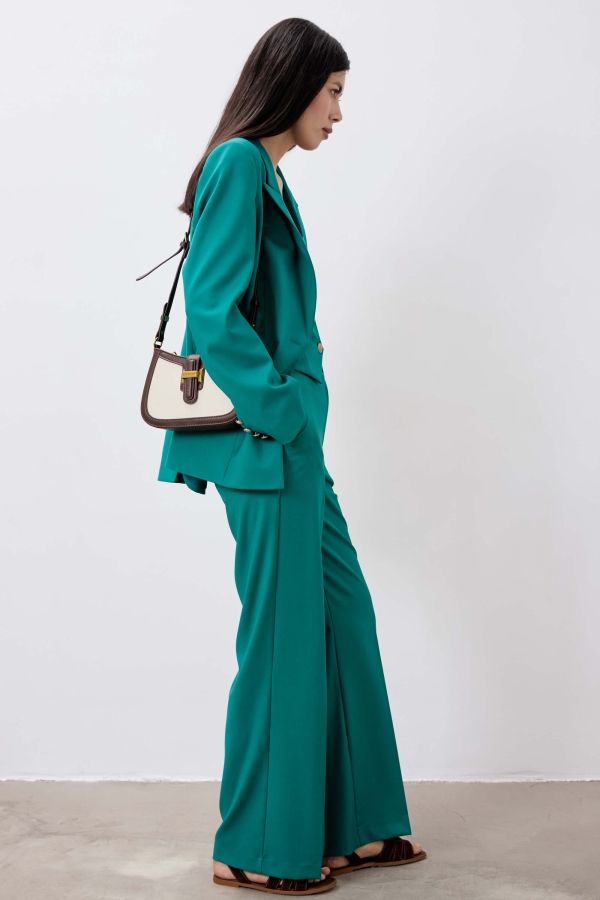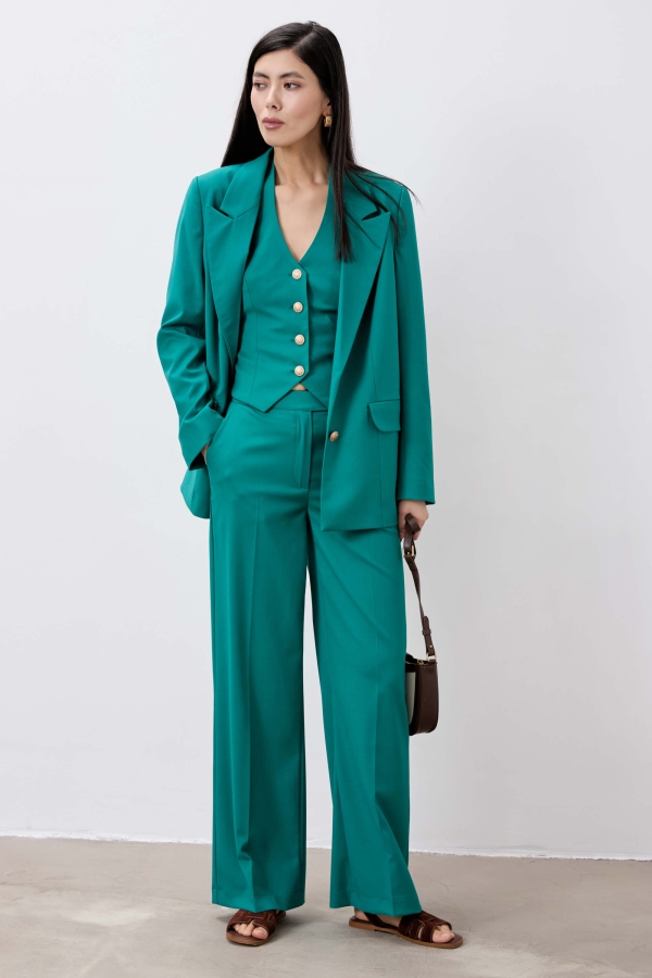 Брюки свободного силуэта благородного оттенка. Средняя посадка на притачном поясе со шлевками. По переду карманы. Застежка гульфик на хлястик с пуговицей и потайной пуговицей.