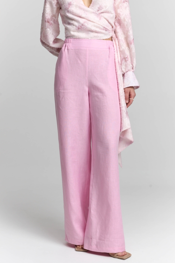 Брюки из из натурального льна в трендовом оттенке. Модель прямого силуэта. По переду боковые карманы и пояс. По спинке пояс на резинке.