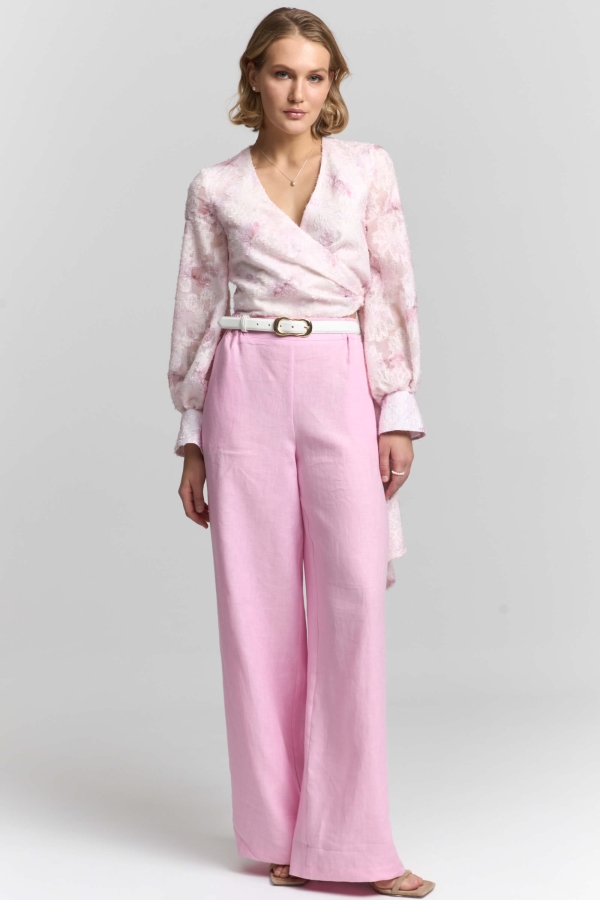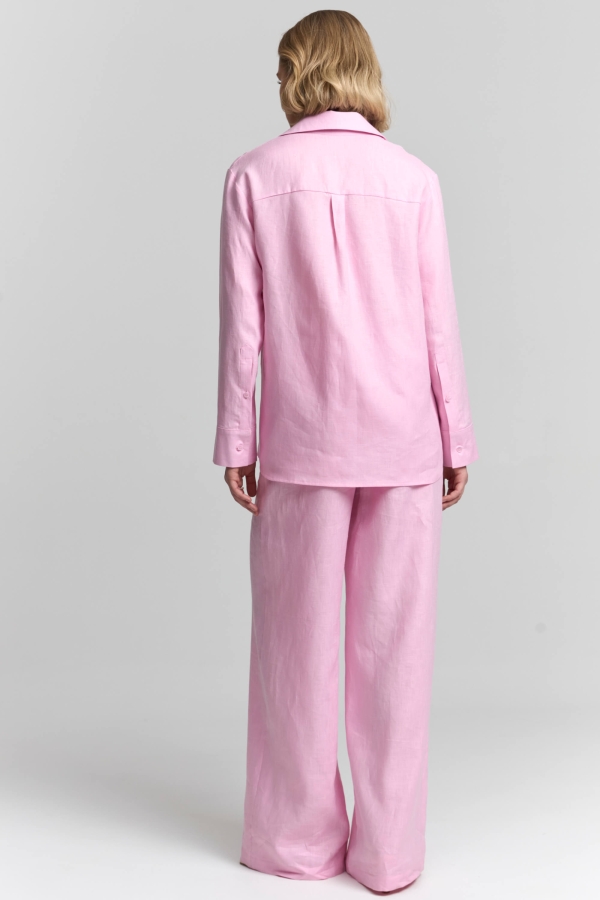 Брюки из из натурального льна в трендовом оттенке. Модель прямого силуэта. По переду боковые карманы и пояс. По спинке пояс на резинке.
