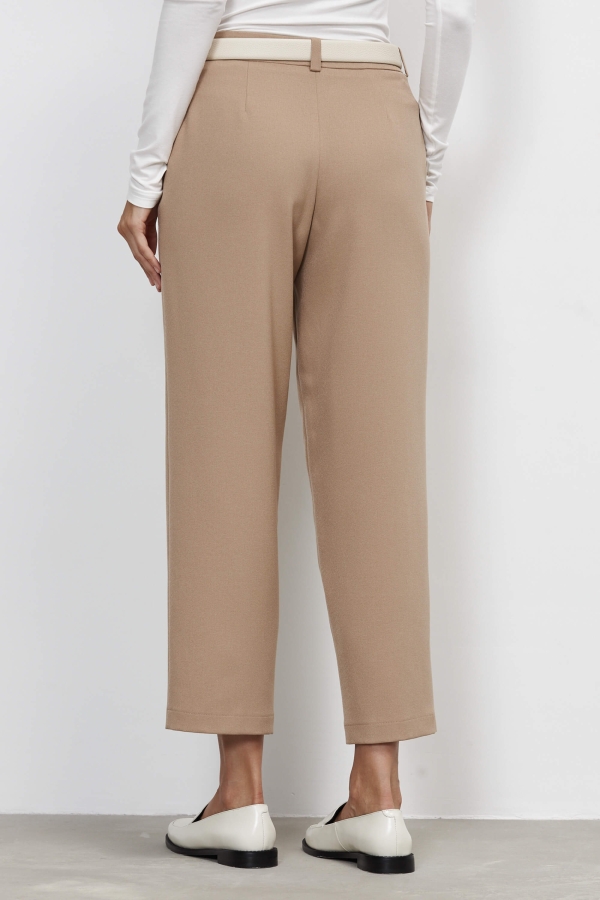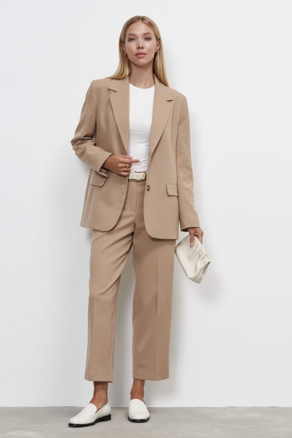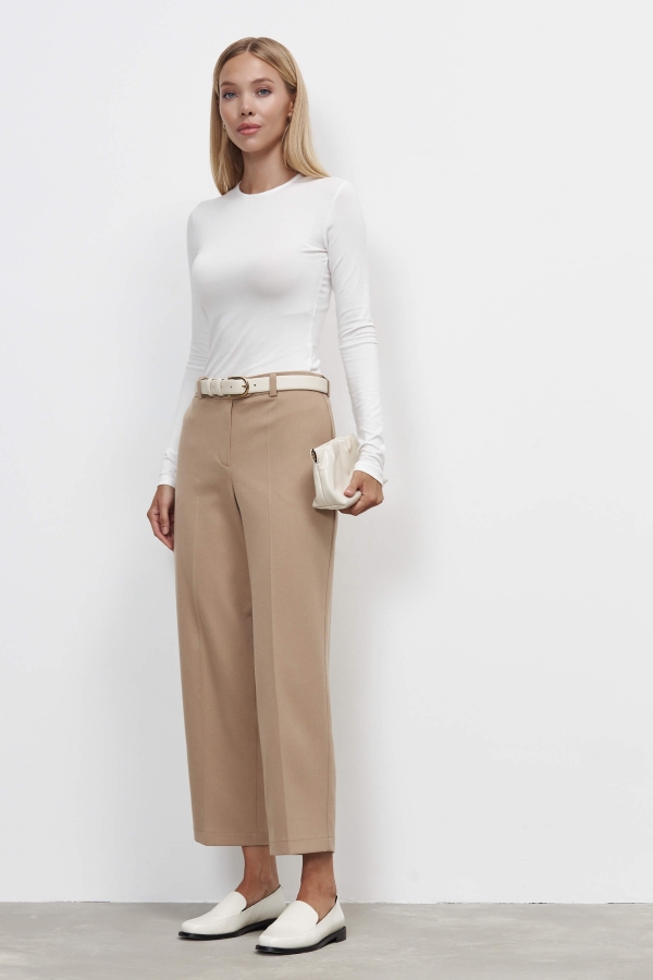Классические брюки средней посадки. Модель укороченная, на средней посадке. Брюки прямые и слегка зауженные к низу. По переду гульфик, застежка на молнию и пуговицу.