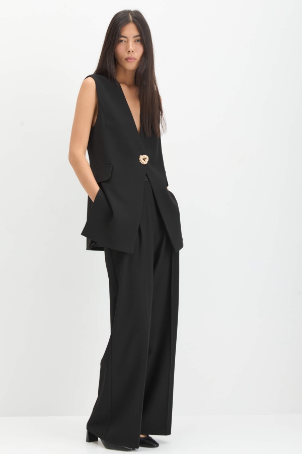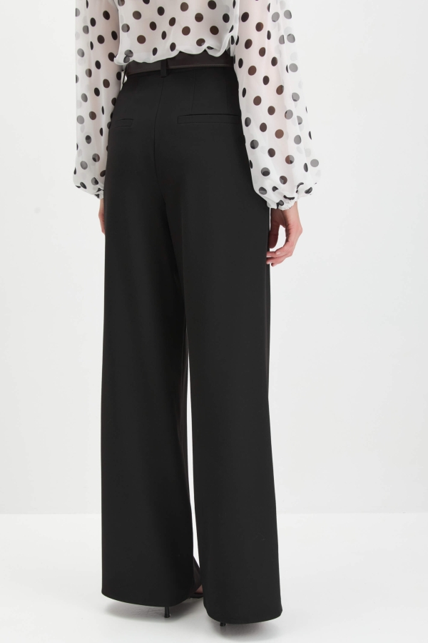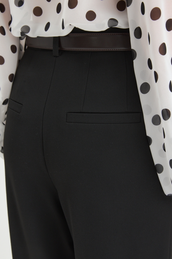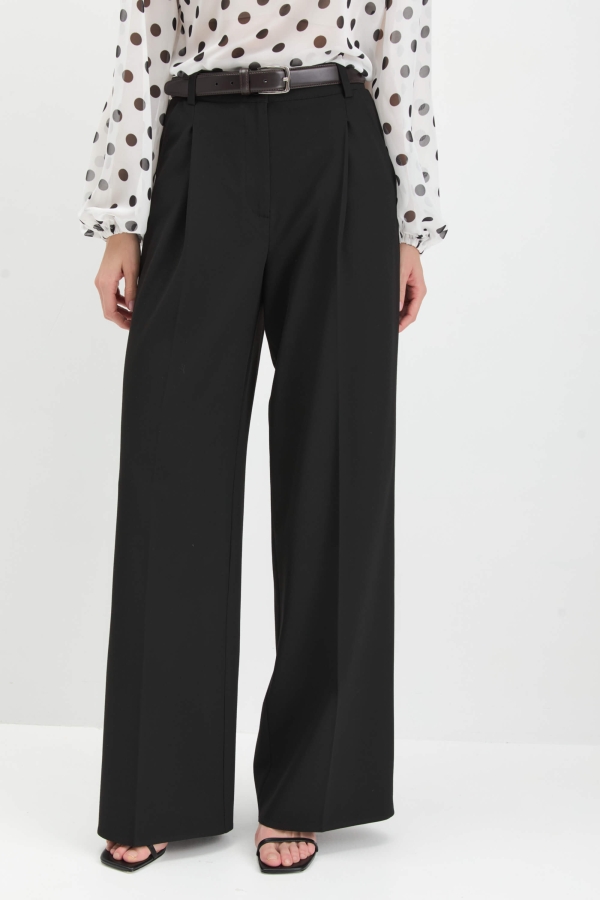 Комфортные брюки из костюмной поливискозы. Прямые свободные брюки с высокой посадкой и стрелками. Боковые карманы, застежка-гульфик на молнию и пуговицу.
