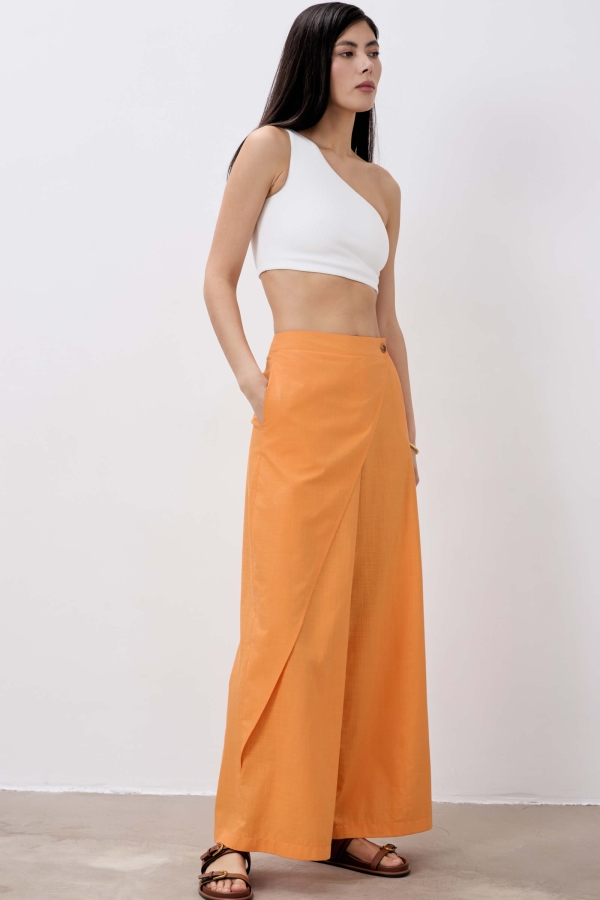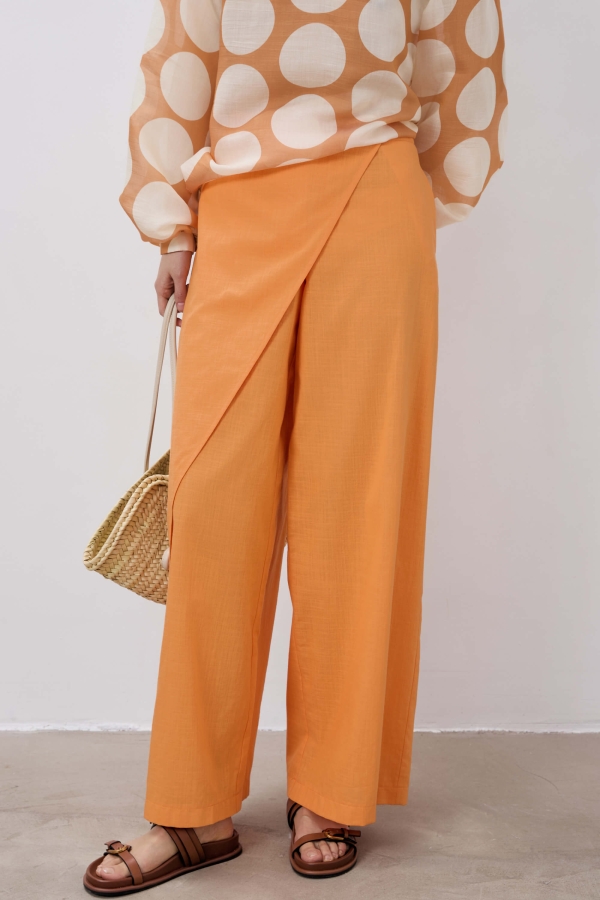 Модель свободного силуэта с асимметричным элементом по переду. Средняя посадка на притачном поясе. В боковом шве карманы. Застежка гульфик с пуговицей.