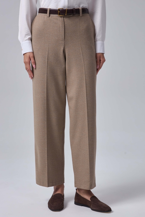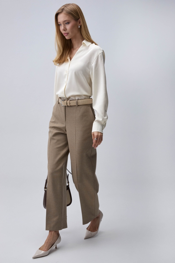 Классические брюки из костюмного полотна с шерстью. Модель прямого силуэта,средней посадки со стрелками. По переду гульфик, застежка на молнию и пуговицу. В боковых швах карманы.
