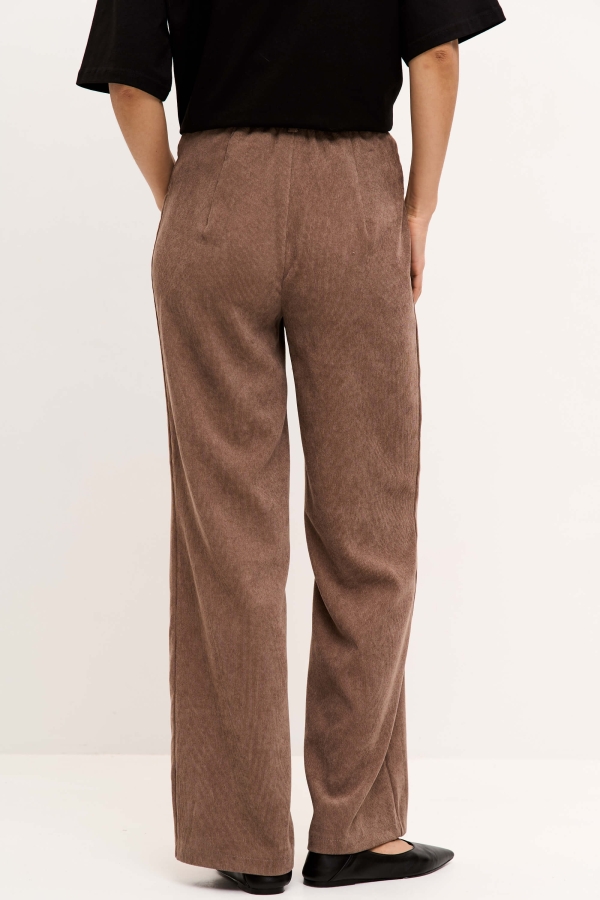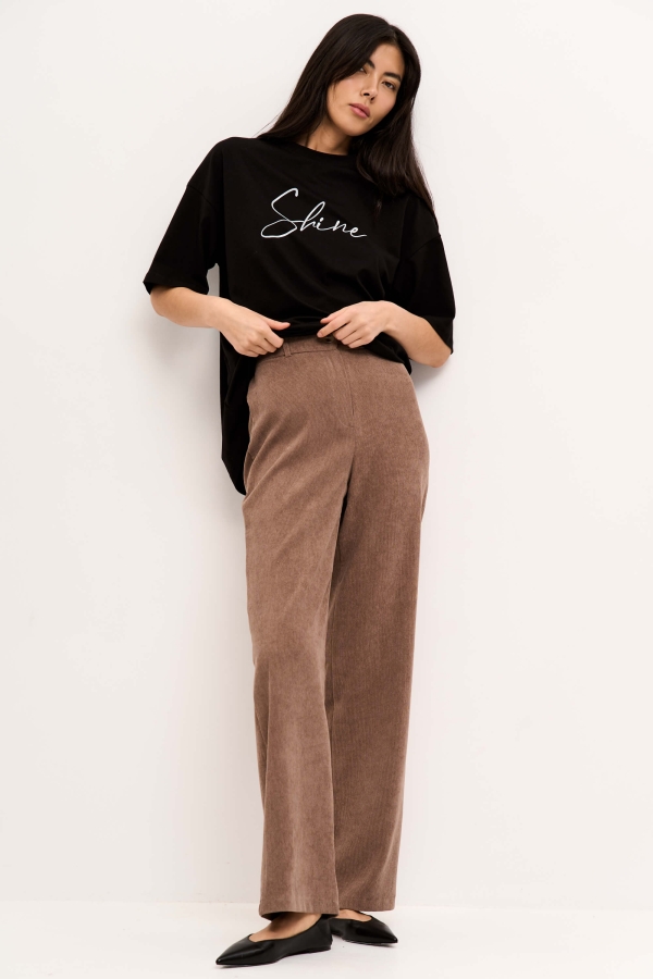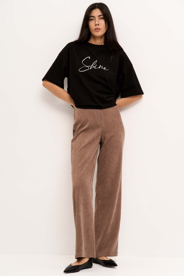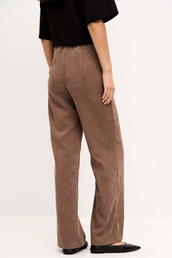 Комфортные брюки из вельвета. Модель прямого силуэта, слегка расширена к низу. Притачной пояс со шлевками, по спинке резинка. Высокая посадка. Застежка-гульфик.
