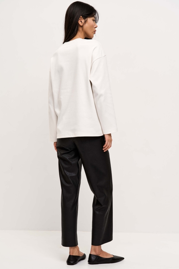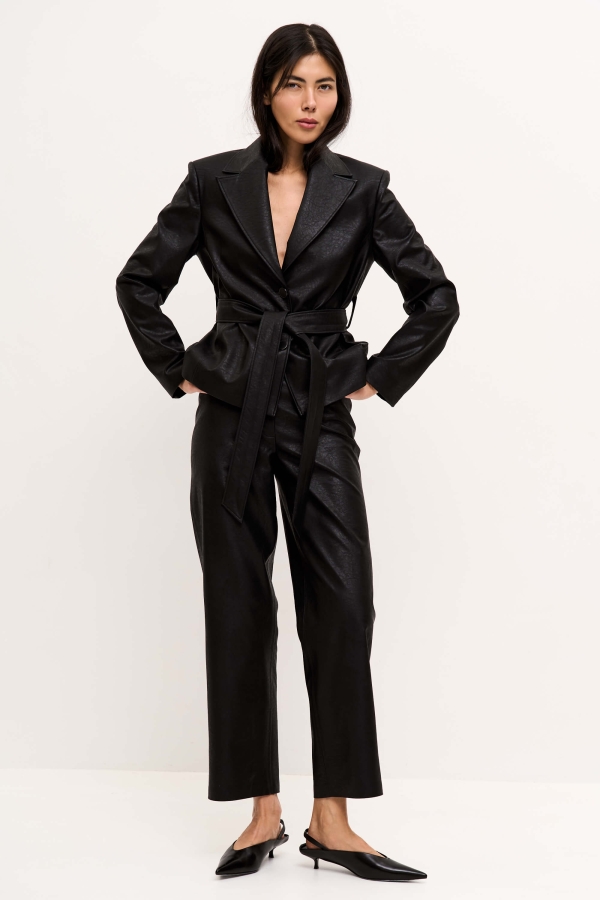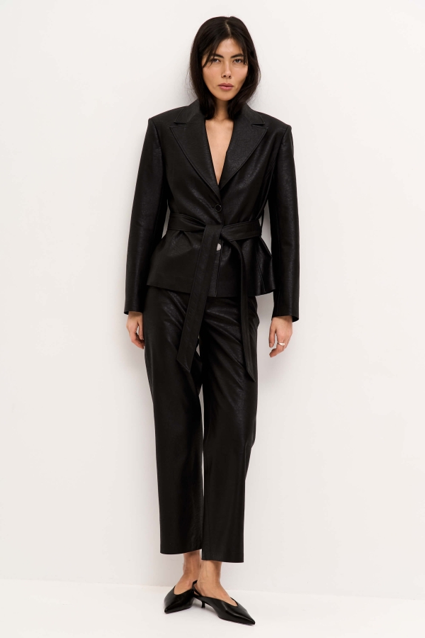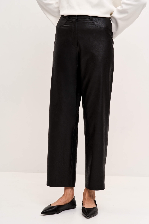 Укороченные брюки из фактурной эко-кожи на хлопке. Полуприлегающие прямые брюки, слегка зауженные к низу, на притачном поясе со шлевками. По переду карманы, застёжка-гульфик и имитация карманов. По спинке резинка для комфортной посадки.