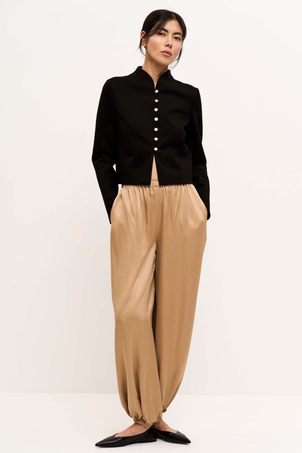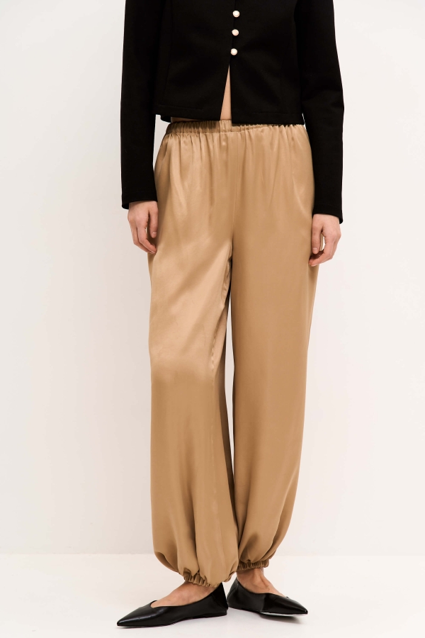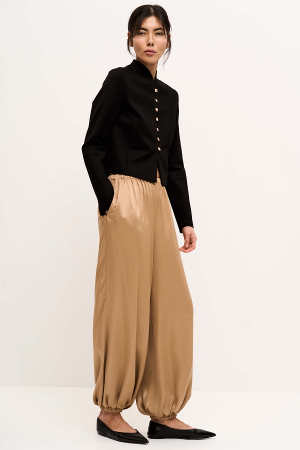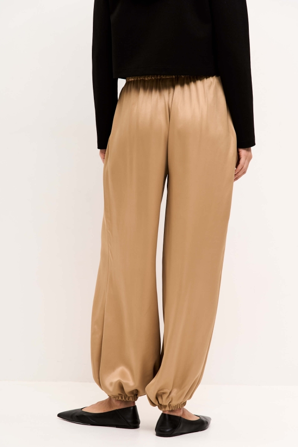 Трендовые брюки-алладины из струящейся вискозы. Модель свободного кроя. Карманы в боковых швах. Пояс и низ изделия на резинке.