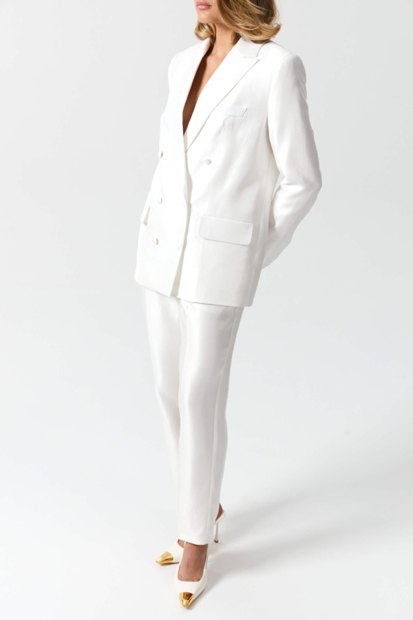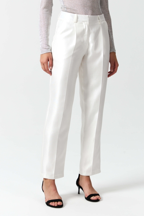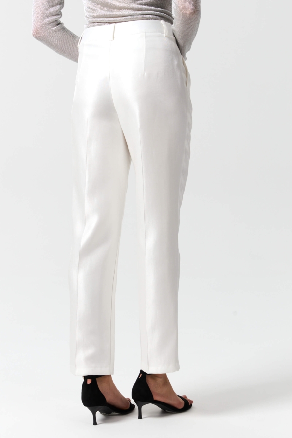 Укороченные брюки из вискозной тафты с благородным сиянием. Модель прямого силуэта, зауженная к низу со стрелками. Пояс притачной со шлевками. Посадка средняя. По переду карманы. Застежка гульфик и потайную пуговицу.