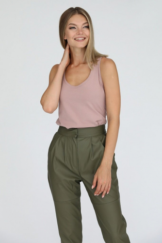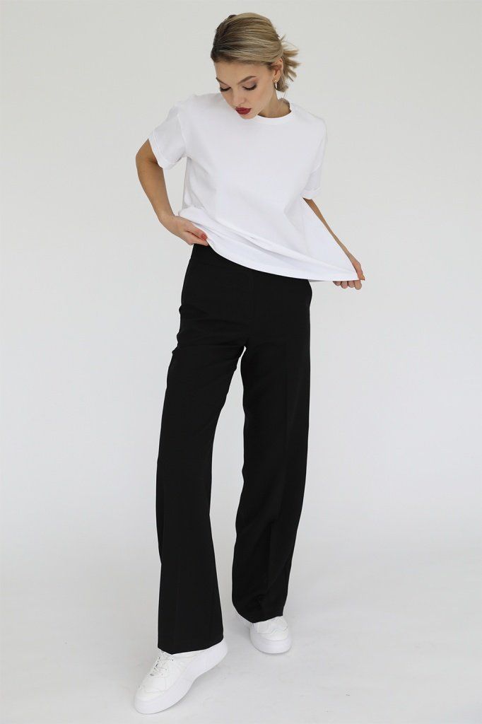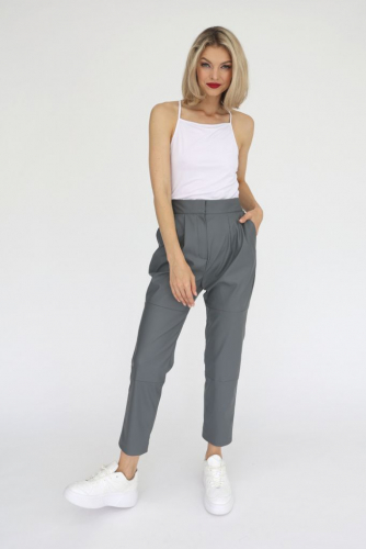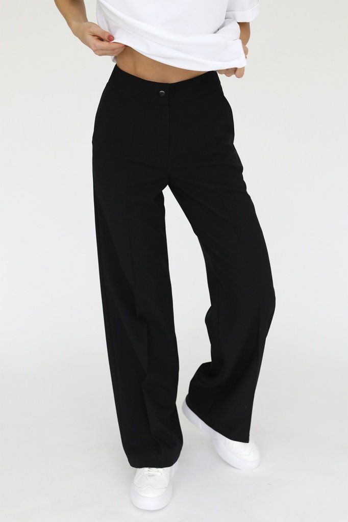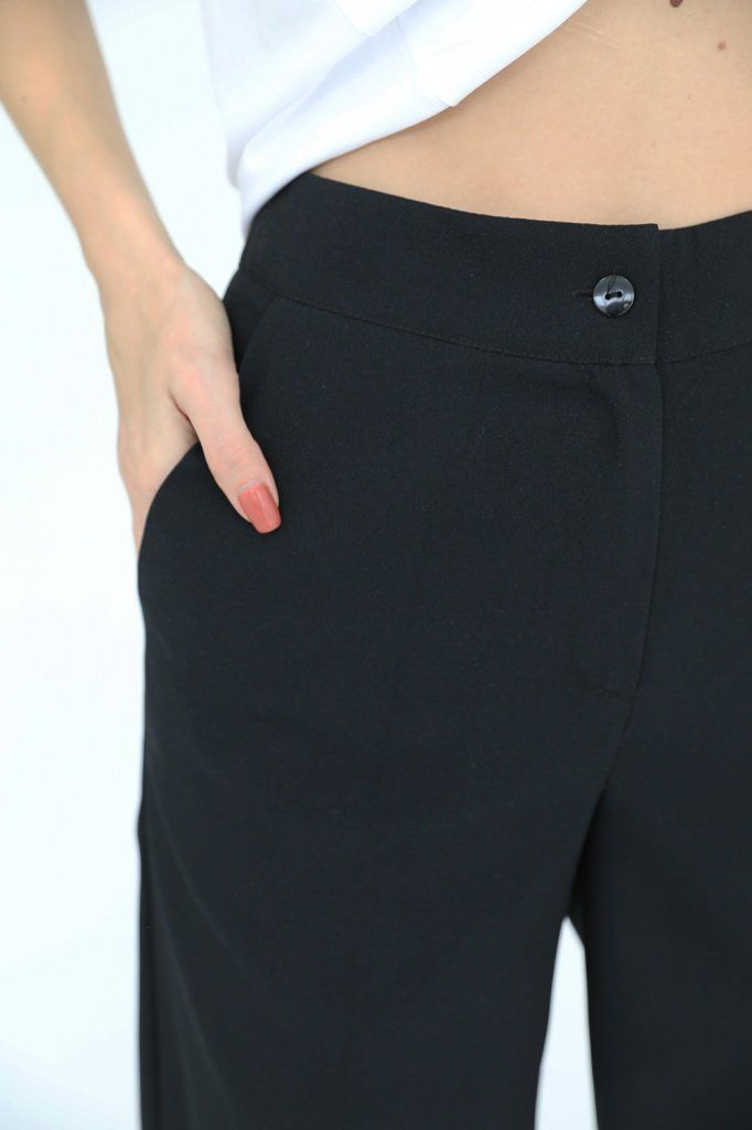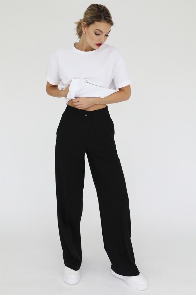 Брюки широкие прямого кроя. Боковые карманы в швах, вытачки на поясе сзади. Выполнены из плотной костюмной ткани, без подкладки.