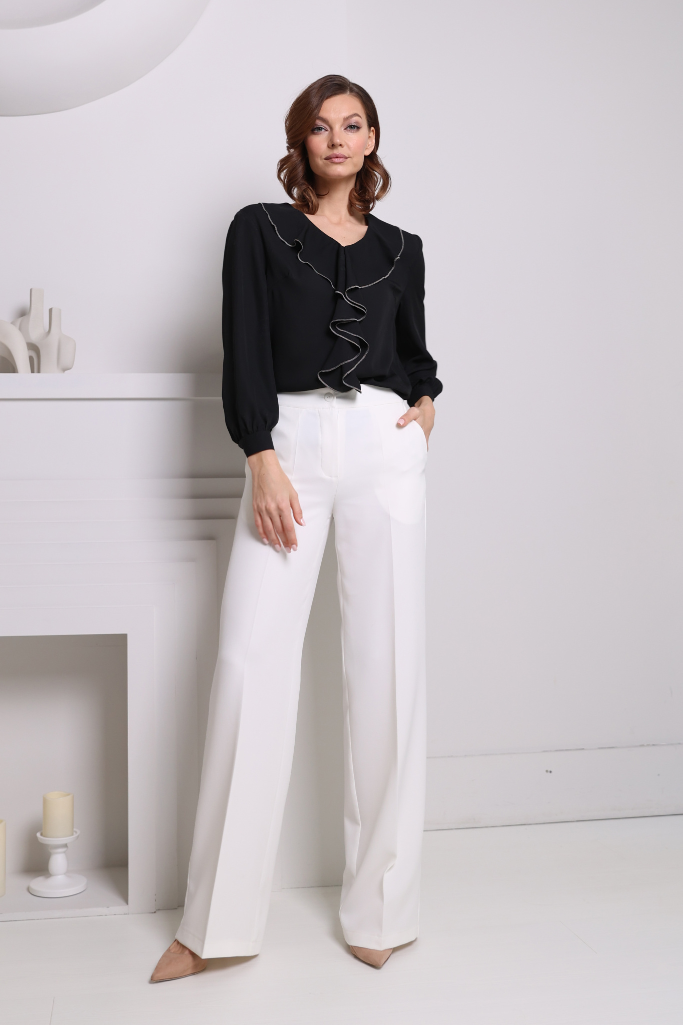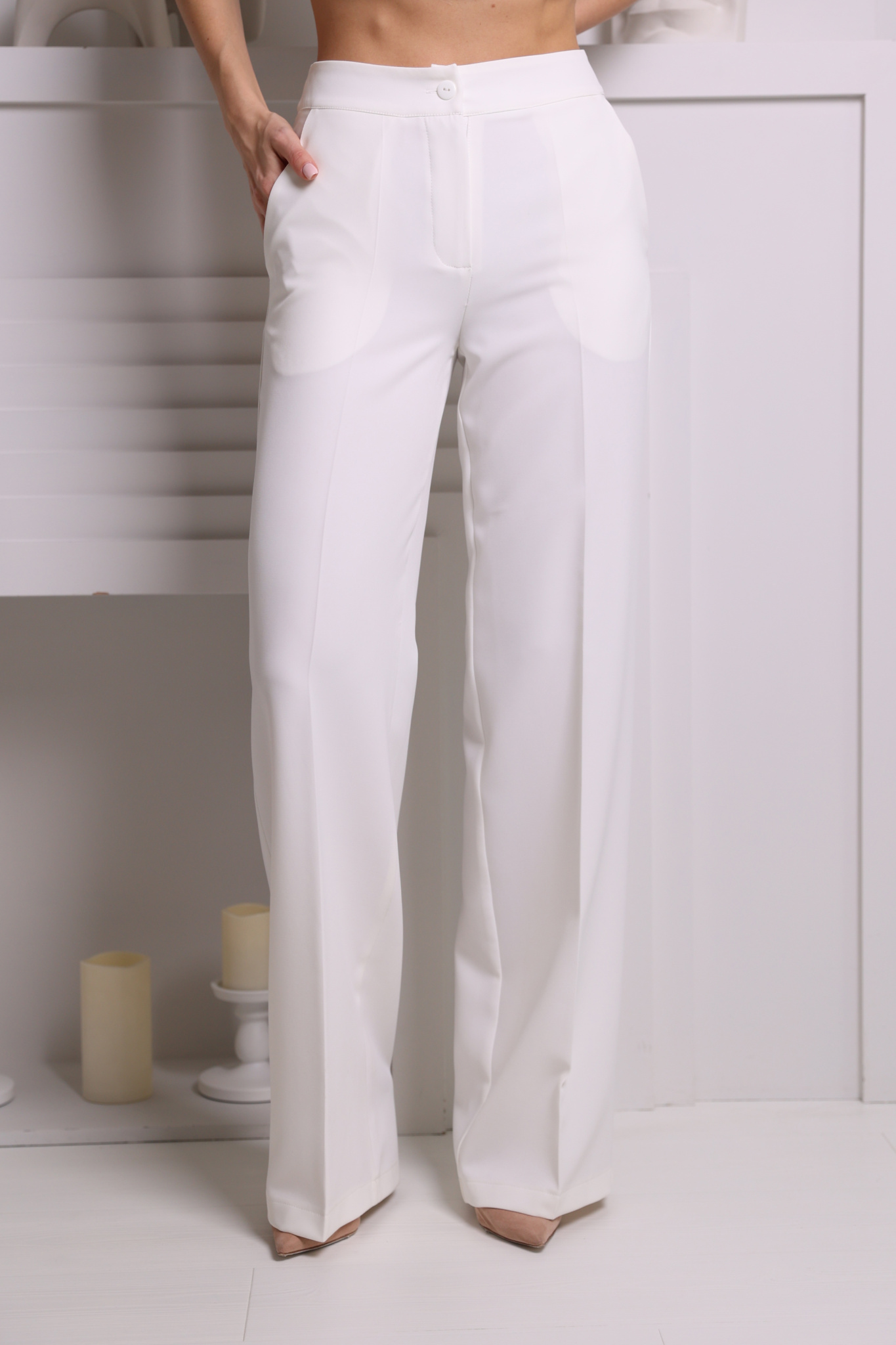Брюки прямого, широкого кроя с притачным поясом. Карманы в боковых швах. Вытачки на поясе сзади.