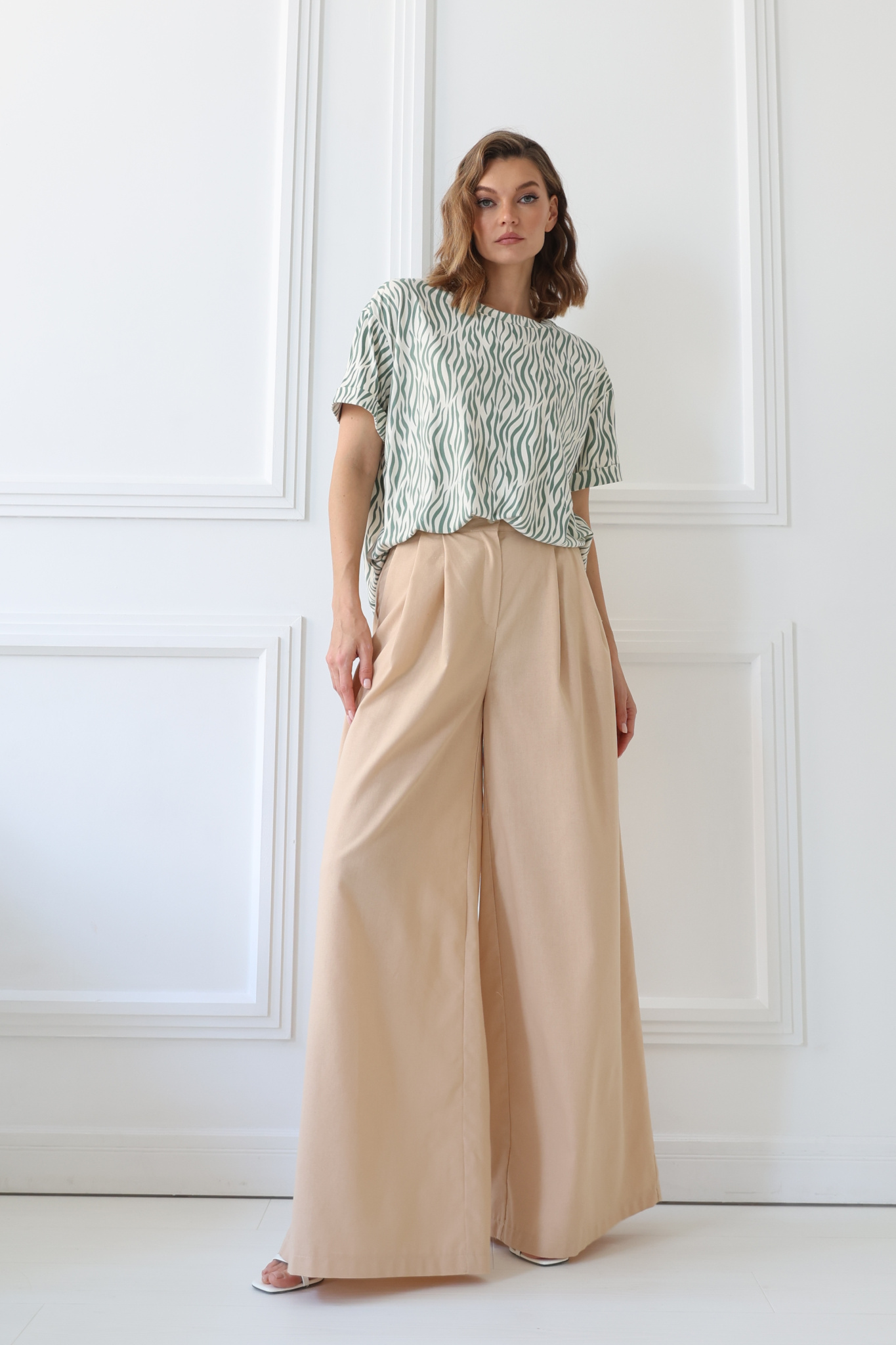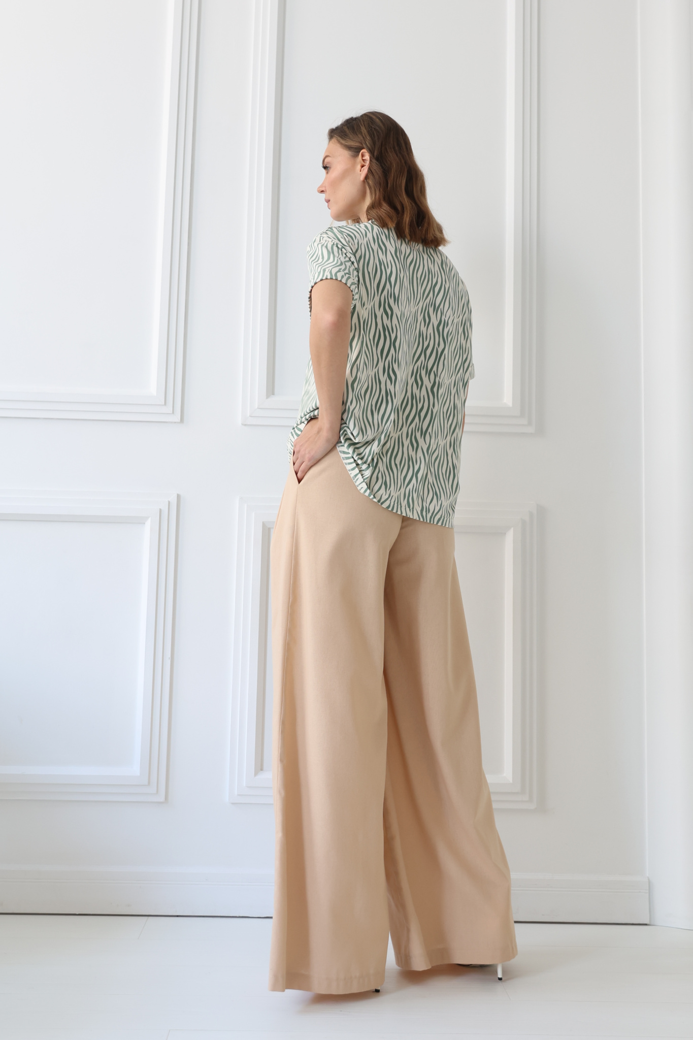 Брюки-палаццо с притачным поясом и защипами по линии талии. Карманы в боковых швах. Застёжка на молнию и пуговицу. Резинка на поясе сзади