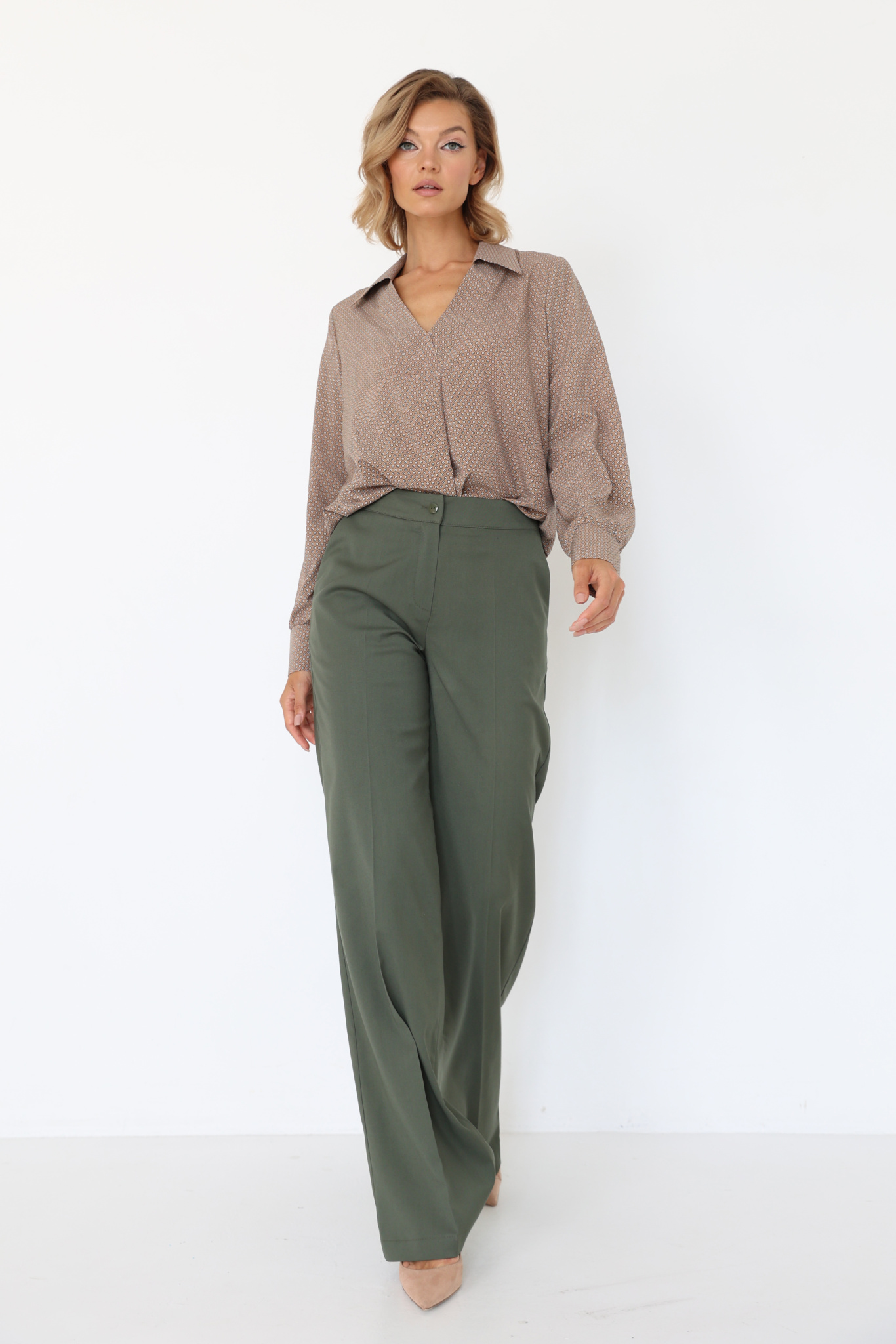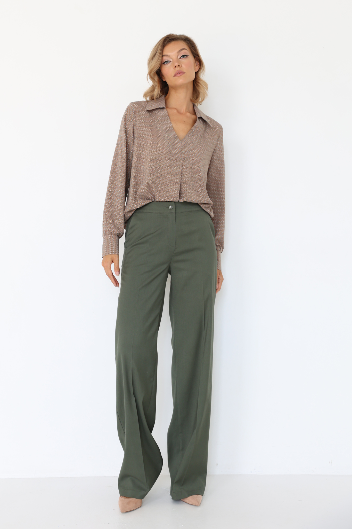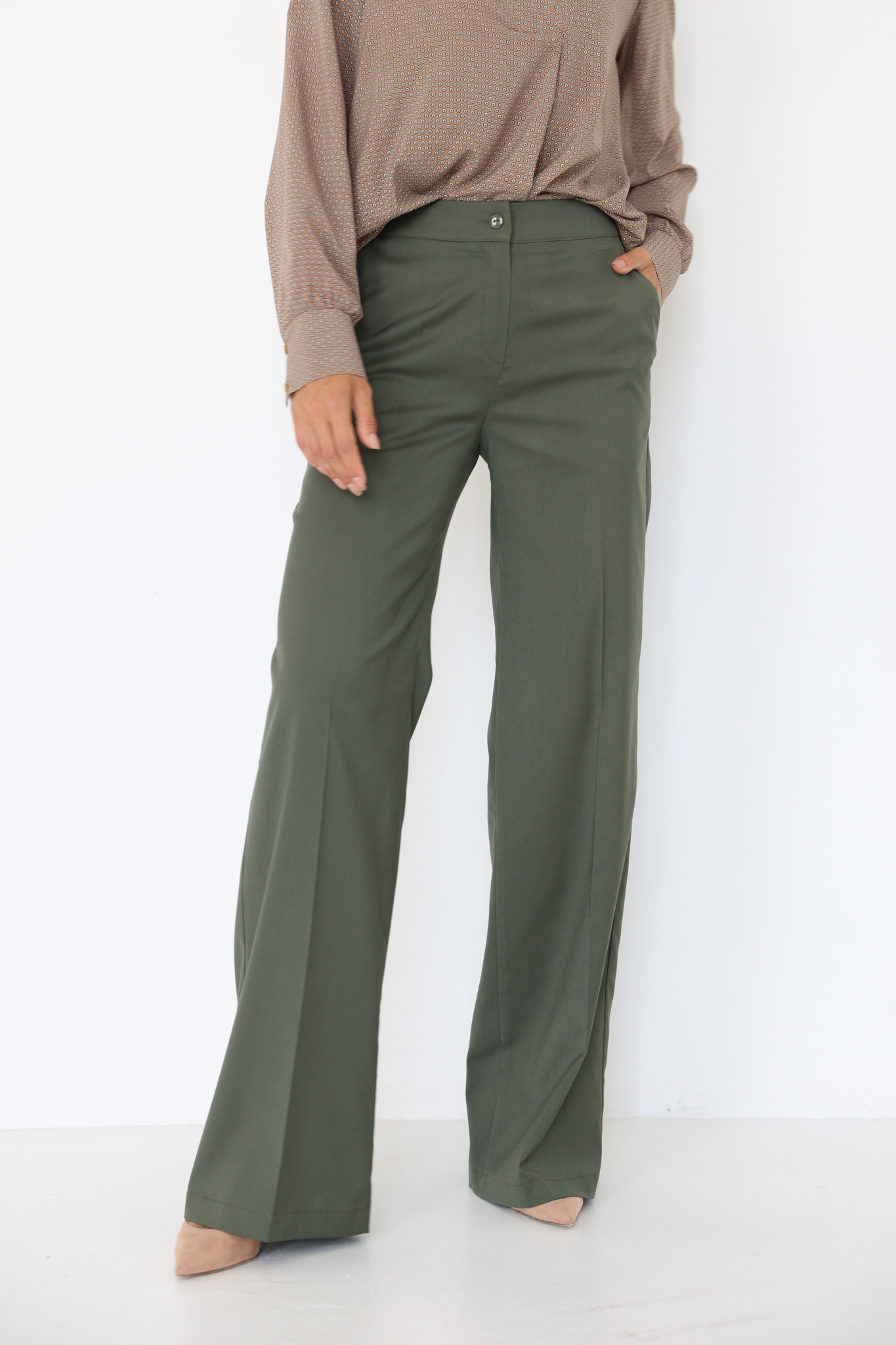 Брюки прямого широкого кроя с притачным поясом. Боковые карманы в швах, вытачки на поясе сзади.