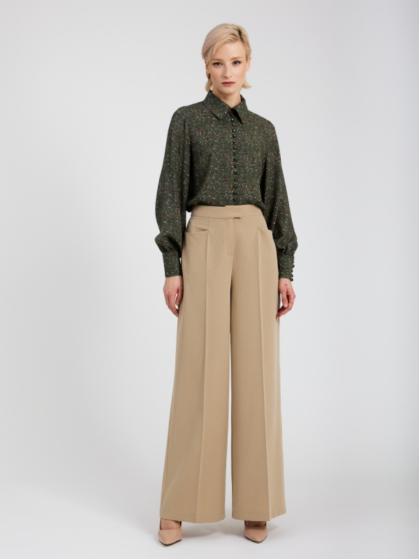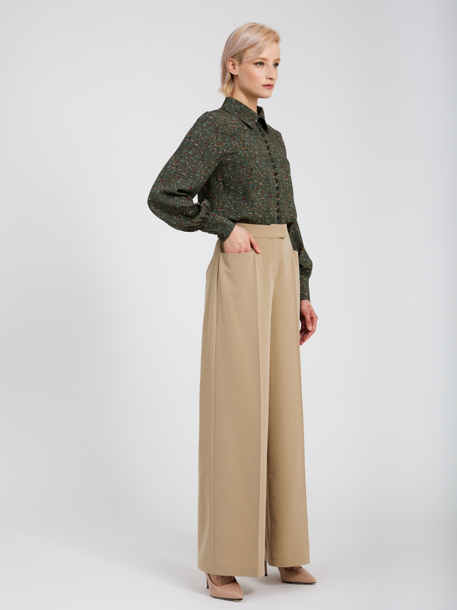 Брюки-палаццо из костюмной однотонной ткани свободного кроя. На полочке, по центру брючин, находится подрез, переходящий в стрелку. В боковой части полочки, карман с горизонтальным входом, для большего удобства. Застежка на молнию, потайную пуговицу и крючок. По центру пояса спинки, имеется резинка для лучшего прилегания по фигуре. Рост фотомодели 175 см. Изделие на модели 42 размера. Длина изделия по боковому шву 112 см. Машинная стирка при 30 градусах