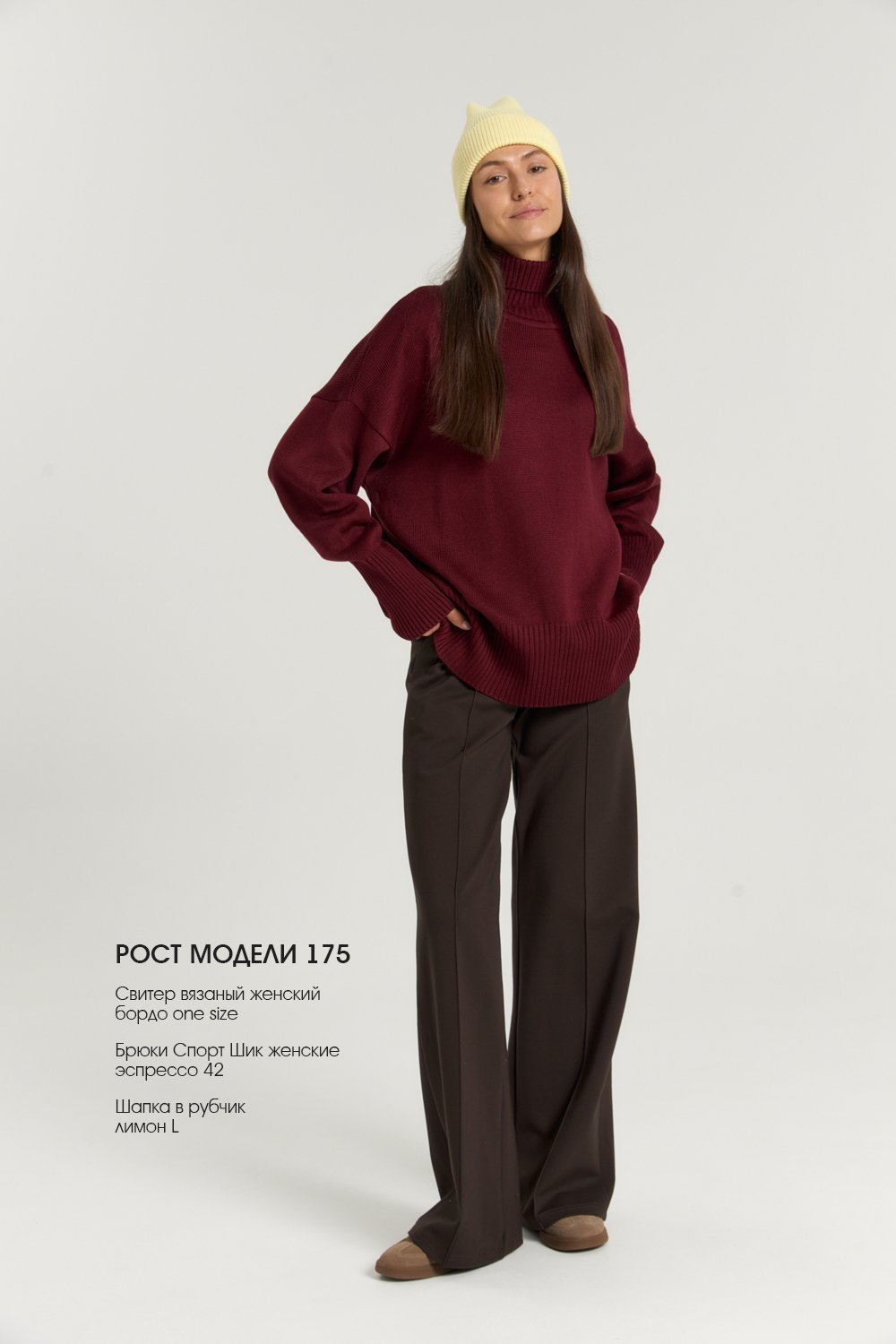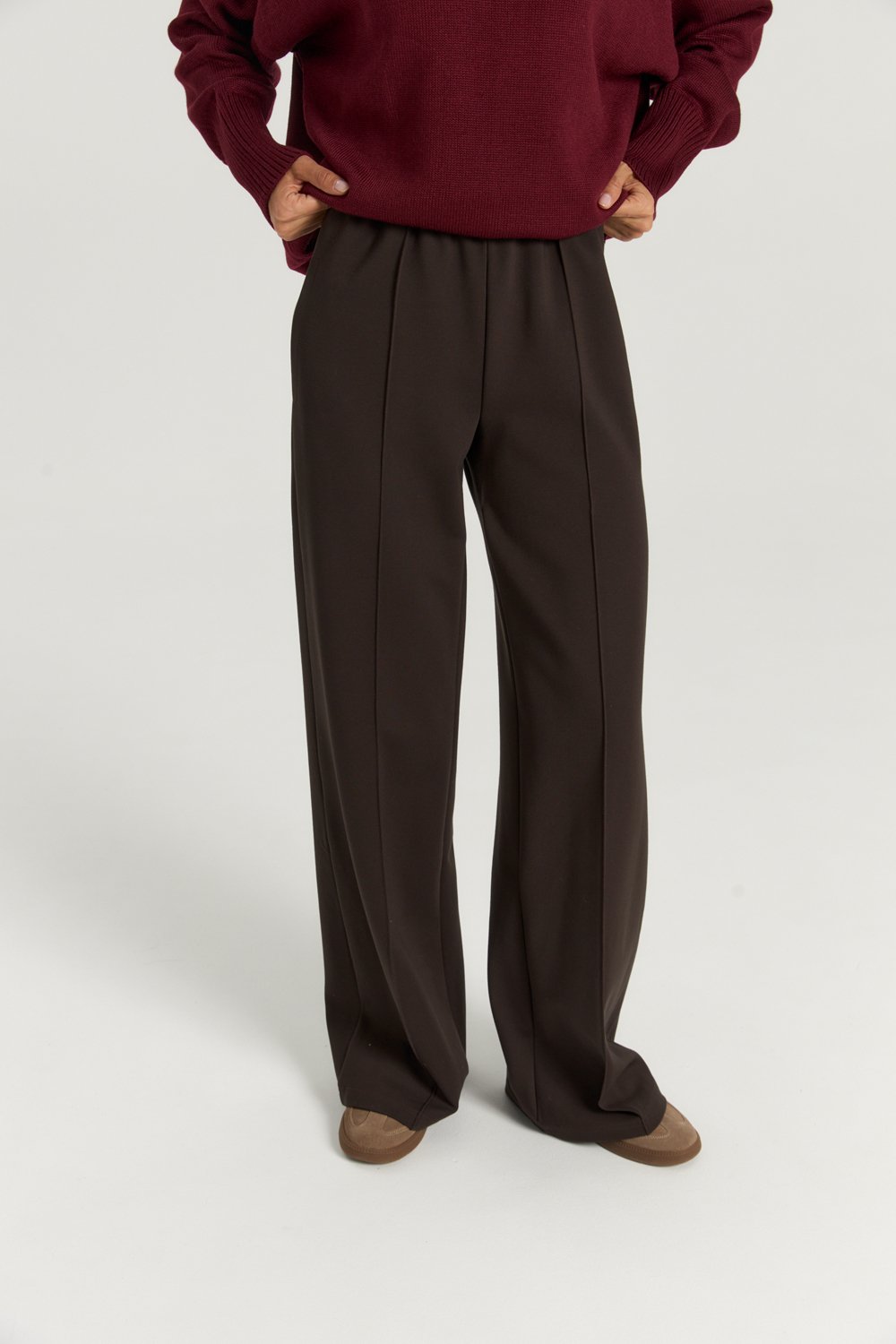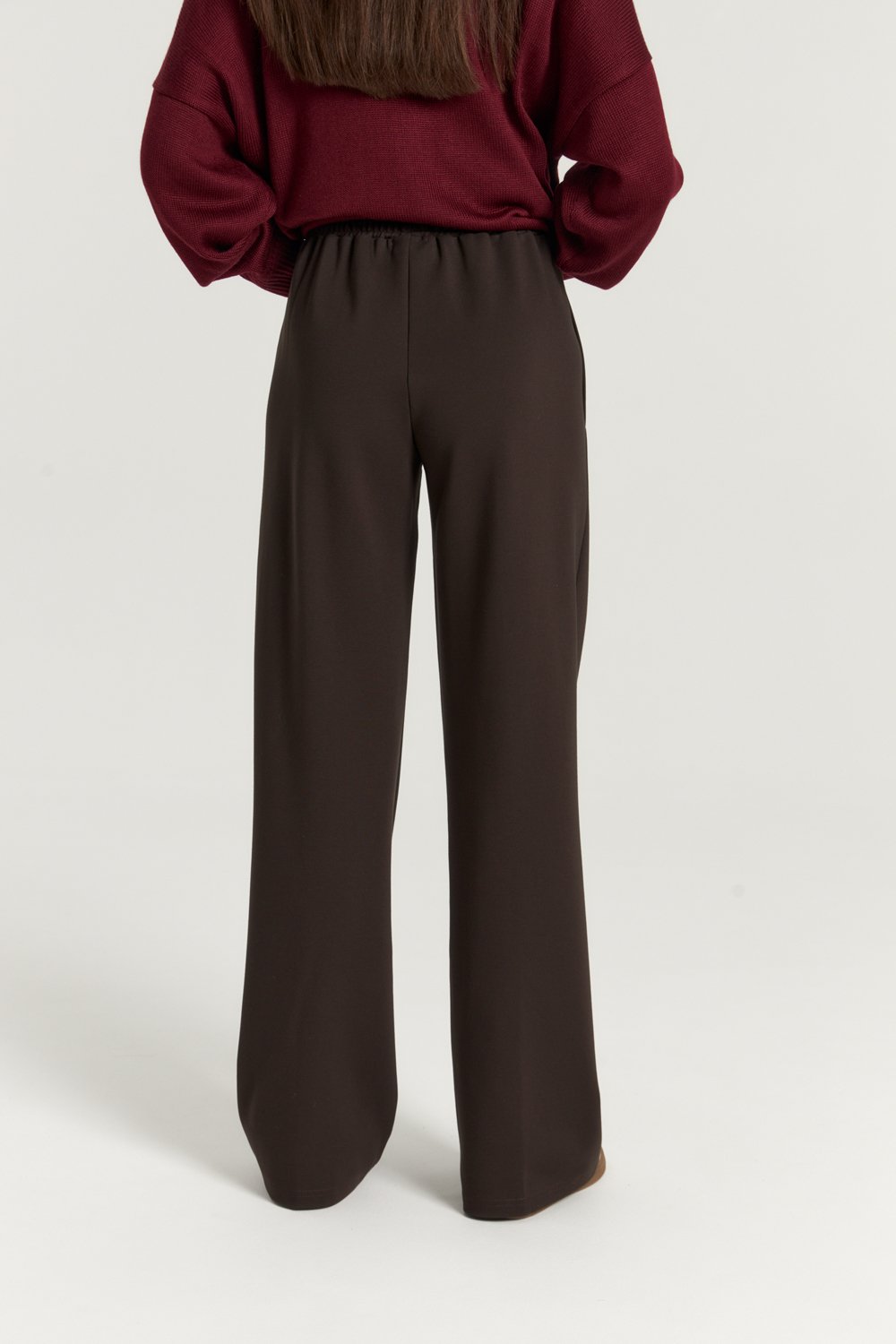 Брюки-трубы со стрелками спереди и поясом на резинке. Карманы в боковых швах.