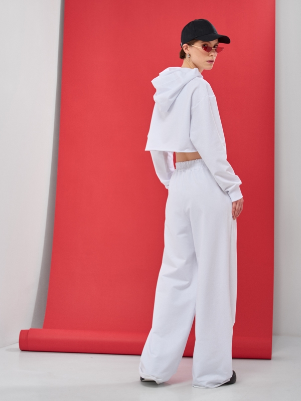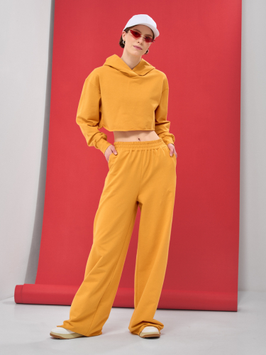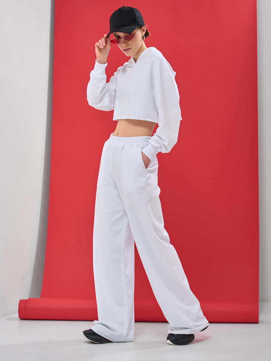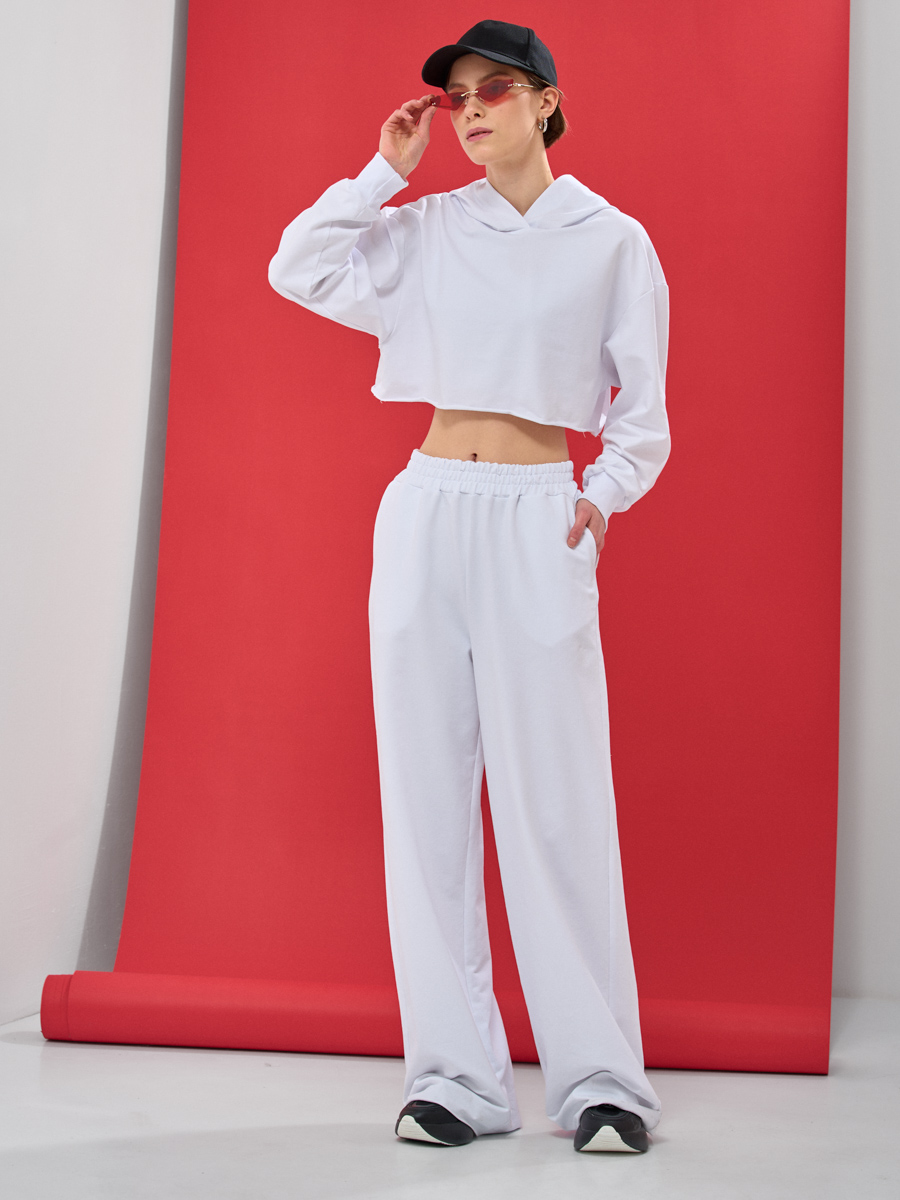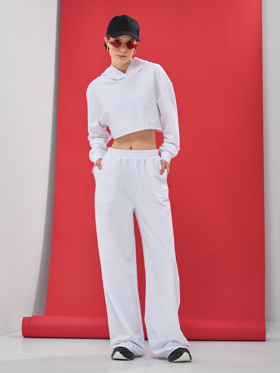 Брюки-клеш из однотонного футера 2-х нитки. Резинка по линии талии. Карманы в боковой части брюк. Край брючин с необработанным срезом. Рост модели 170 см. Изделие на модели 42р-ра. Длина брюк по боковому шву 109 см. Машинная стирка при 30
