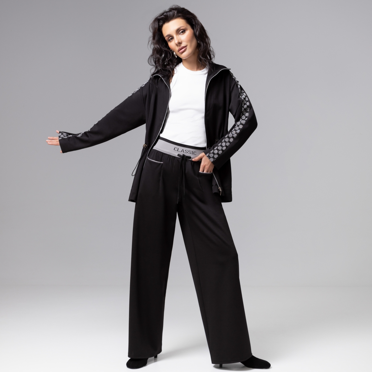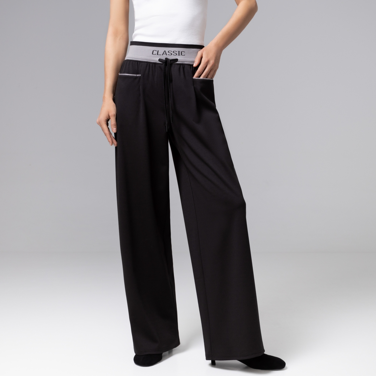 Они подчёркивают независимость, элегантность и умение быть разной: строгой, смелой, женственной. Брюки коллекции PREMIUM выглядят так, будто у них есть собственный менеджер по стилю. Широкая трикотажная резинка на поясе обеспечивает максимальный комфорт, одновременно добавляя современный акцент и сохраняя безупречную посадку. Изделие с карманами.