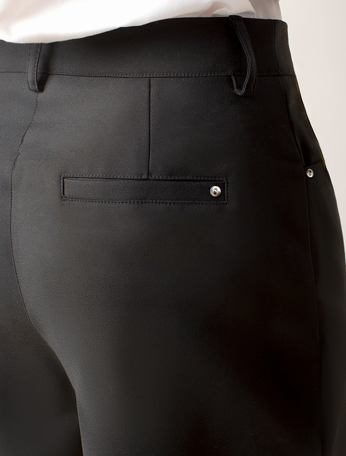 Брюки-трубы выполнены из плотной хлопковой эластичной ткани с добавлением нейлона. Любимая классика делового стиля, которая должна быть в любом гардеробе, так как такая вещь практична и многофункциональна. Для особого случая на важной встрече в паре с блузкой или для офисного дресс-кода с топом и жакетом. В повседневной жизни с более неформальным верхом и обувью на высоком или низком каблуке.