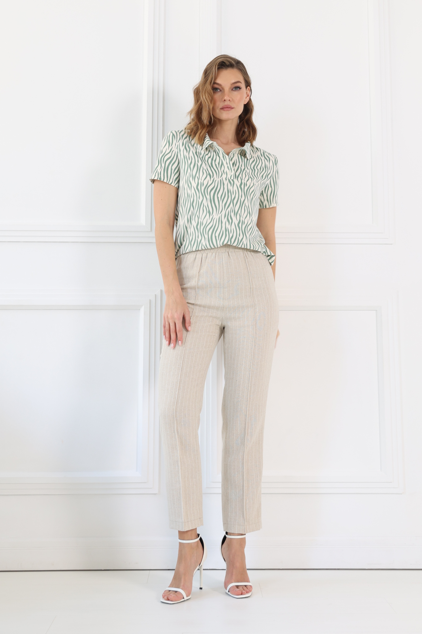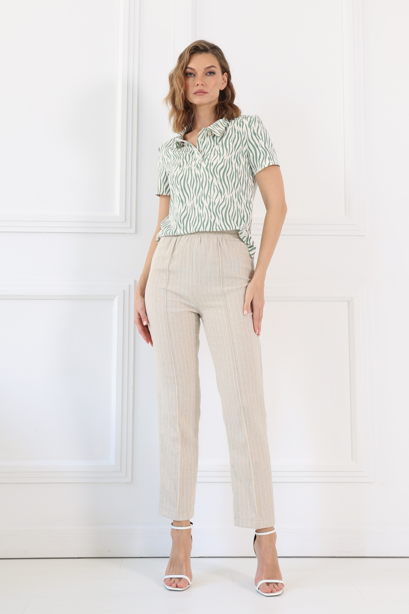 Прямые, укороченные брюки из смесового льна. Пояс на застроченной широкой резинке. Отстроченные стрелки.
