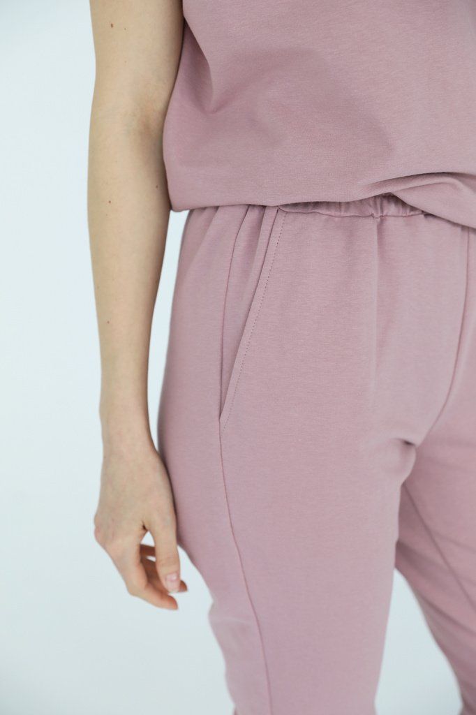 Брюки узкие из двухниточного футера. Боковые карманы в швах, резинка в поясе.