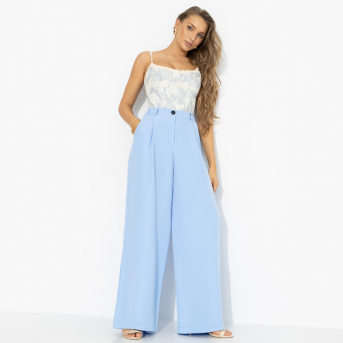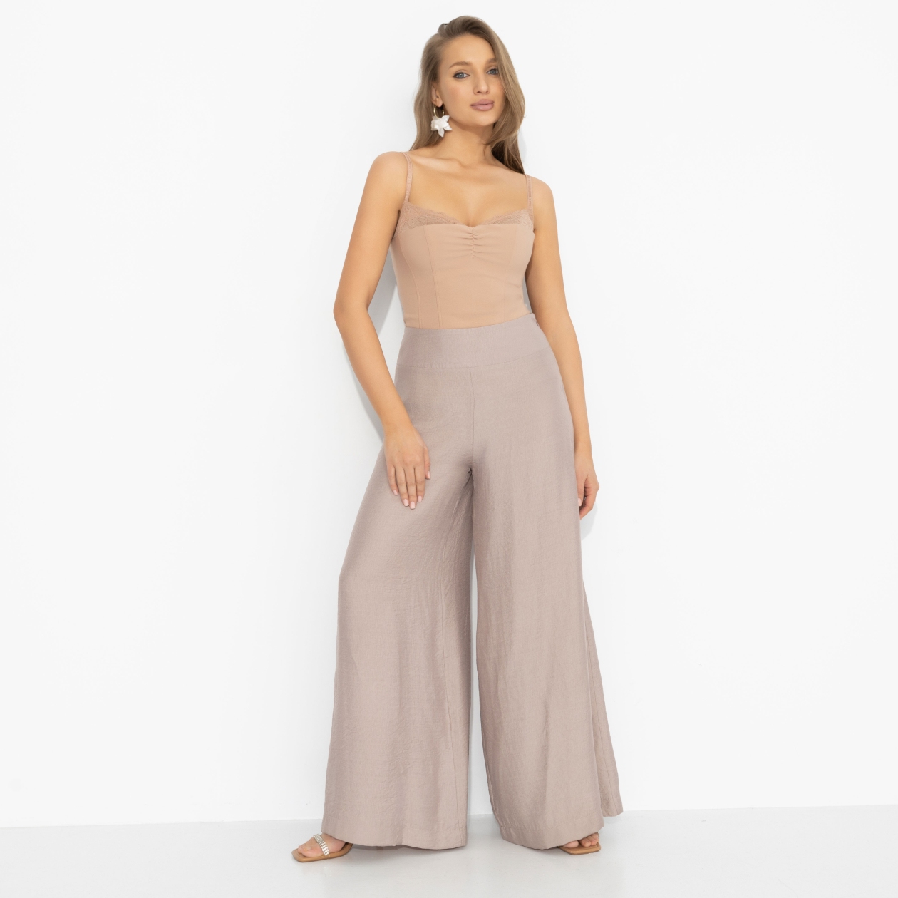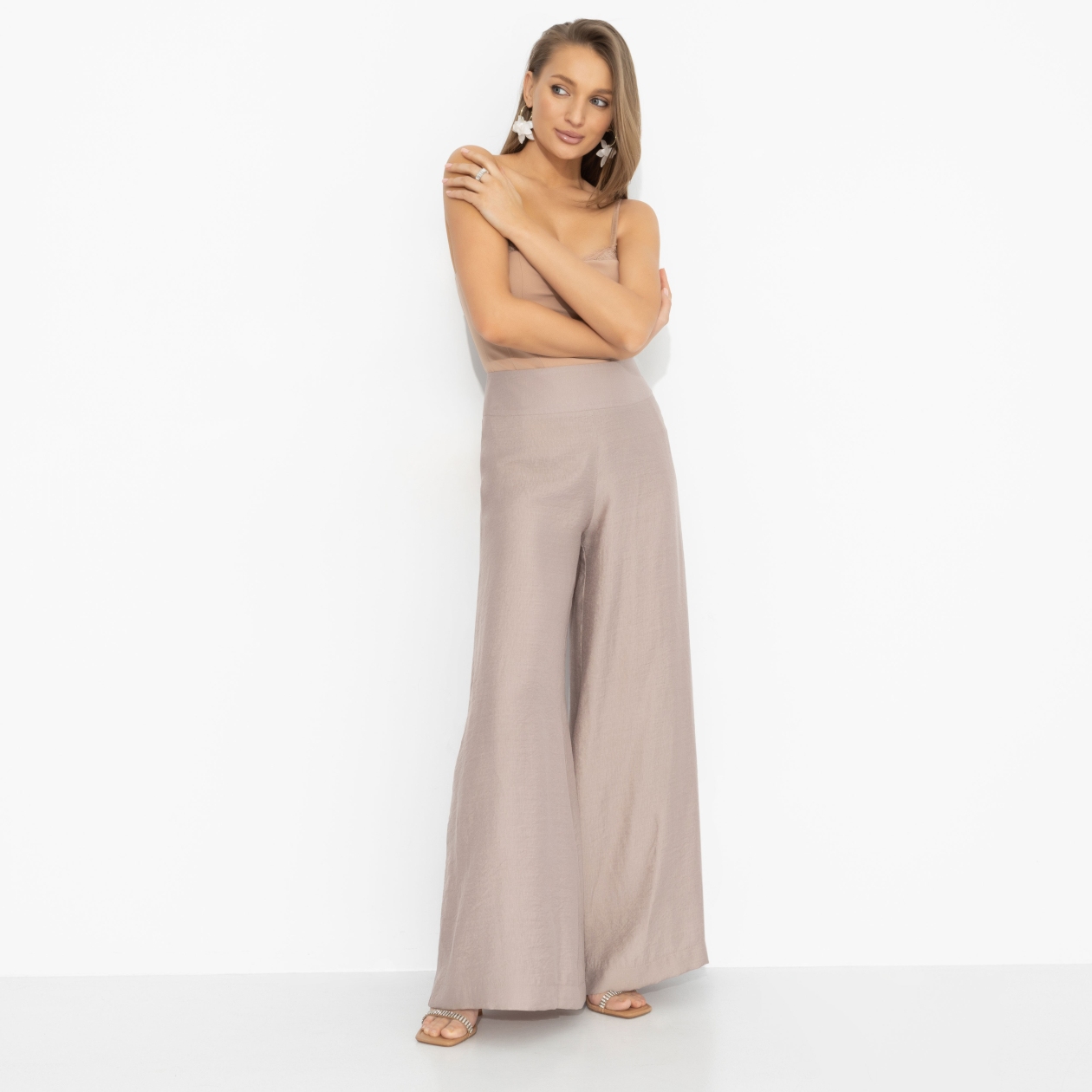 Эти брюки не просто сидят, они будто текут. Широкие палаццо цвета нежного перламутра двигаются как густой напиток: плавно, глубоко, без резких углов. В них хочется идти чуть медленнее – чтобы каждый шаг был замечен. Высокая посадка подчёркивает талию, свободный крой вытягивает силуэт в одну длинную вертикаль. Лёгкая струящаяся ткань мягко скользит по коже, держит форму и красиво раскрывается в движении. Эффект – как у каблуков!