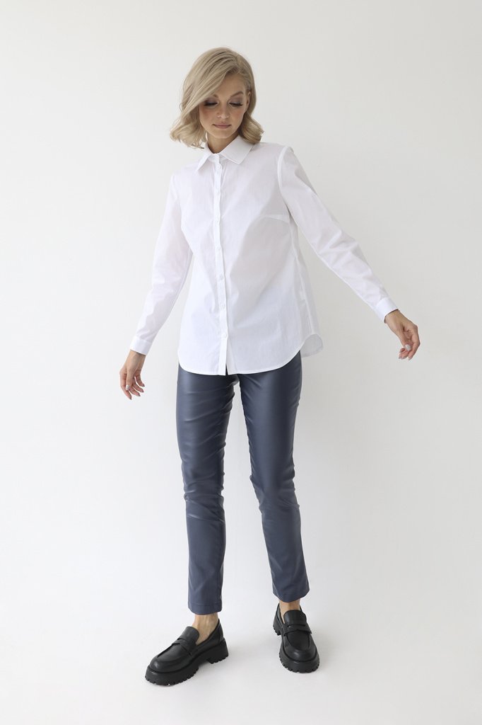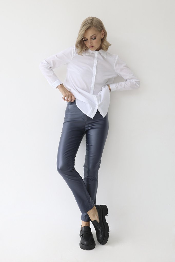 Брюки зауженные со средней посадкой, притачным поясом и шлевками, застежкой на молнию.